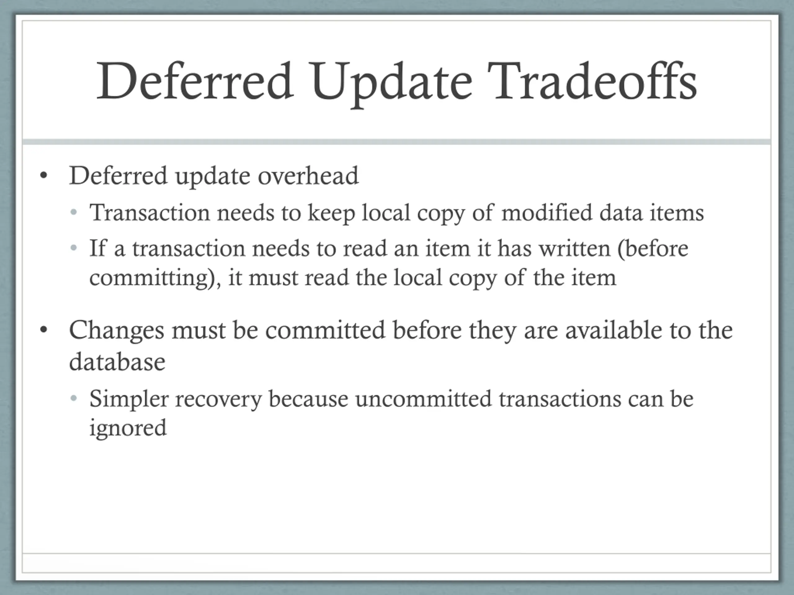 Deferred Update Tradeoffs Deferred update overhead Transaction needs to keep local copy of modified data items If a transaction needs to read an item it has written (before committing), it must read the local copy of the item Changes must be committed before they are available to the database Simpler recovery because uncommitted transactions can be ignored