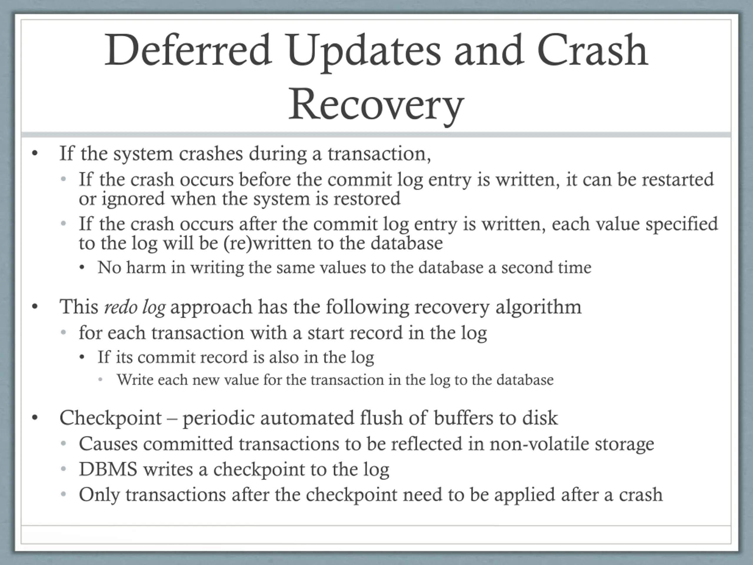 Deferred Updates and Crash Recovery If the system crashes during a transaction, If the crash occurs before the commit log entry is written, it can be restarted or ignored when the system is restored If the crash occurs after the commit log entry is written, each value specified to the log will be (re)written to the database No harm in writing the same values to the database a second time This redo log approach has the following recovery algorithm for each transaction with a start record in the log If its commit record is also in the log Write each new value for the transaction in the log to the database Checkpoint periodic automated flush of buffers to disk Causes committed transactions to be reflected in non-volatile storage DBMS writes a checkpoint to the log Only transactions after the checkpoint need to be applied after a crash