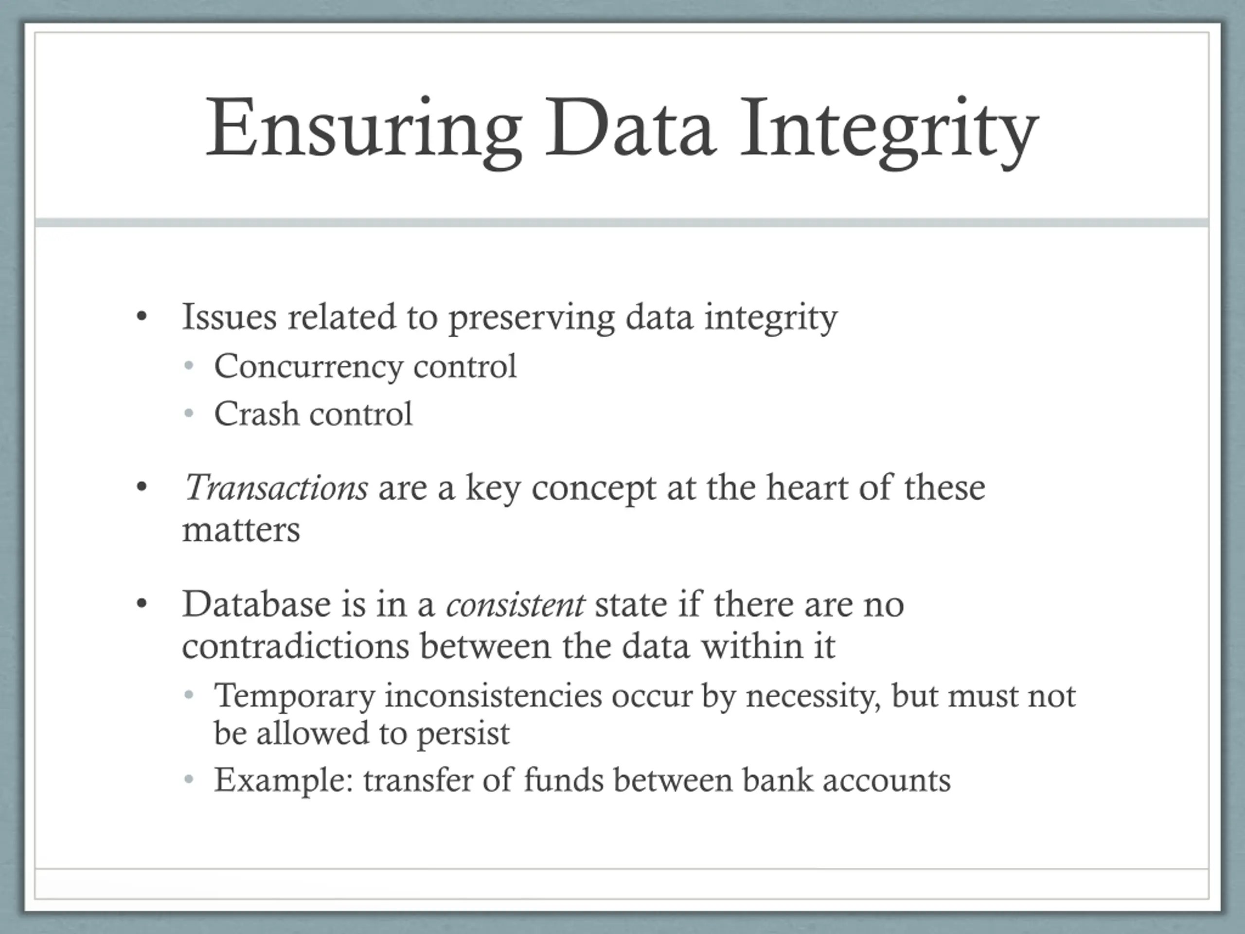 Ensuring Data Integrity Issues related to preserving data integrity Concurrency control Crash control Transactions are a key concept at the heart of these matters Database is in a consistent state if there are no contradictions between the data within it Temporary inconsistencies occur by necessity, but must not be allowed to persist Example: transfer of funds between bank accounts