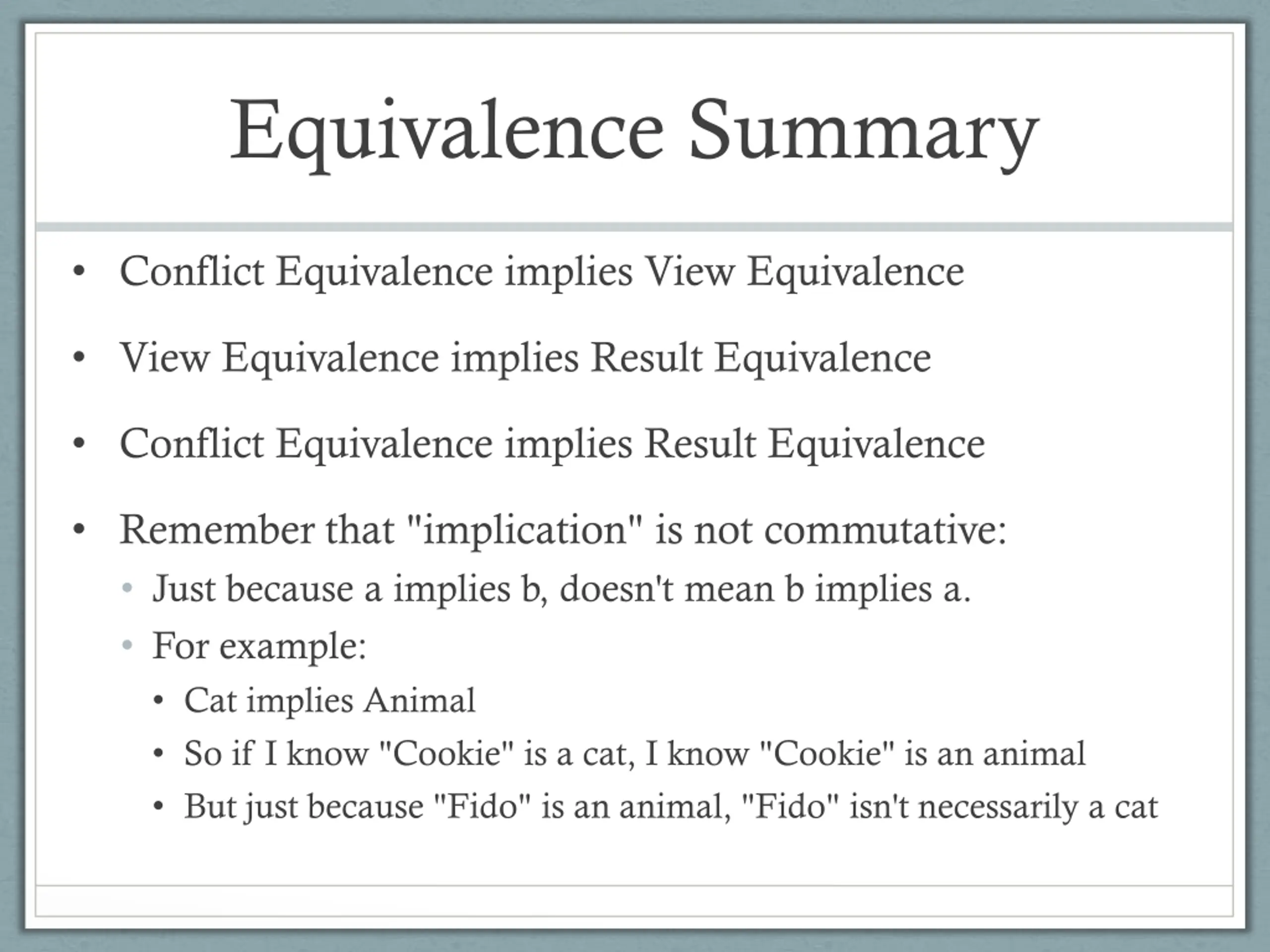 Equivalence Summary Conflict Equivalence implies View Equivalence View Equivalence implies Result Equivalence Conflict Equivalence implies Result Equivalence Remember that "implication" is not commutative: Just because a implies b, doesn't mean b implies a. For example: Cat implies Animal So if I know "Cookie" is a cat, I know "Cookie" is an animal But just because "Fido" is an animal, "Fido" isn't necessarily a cat