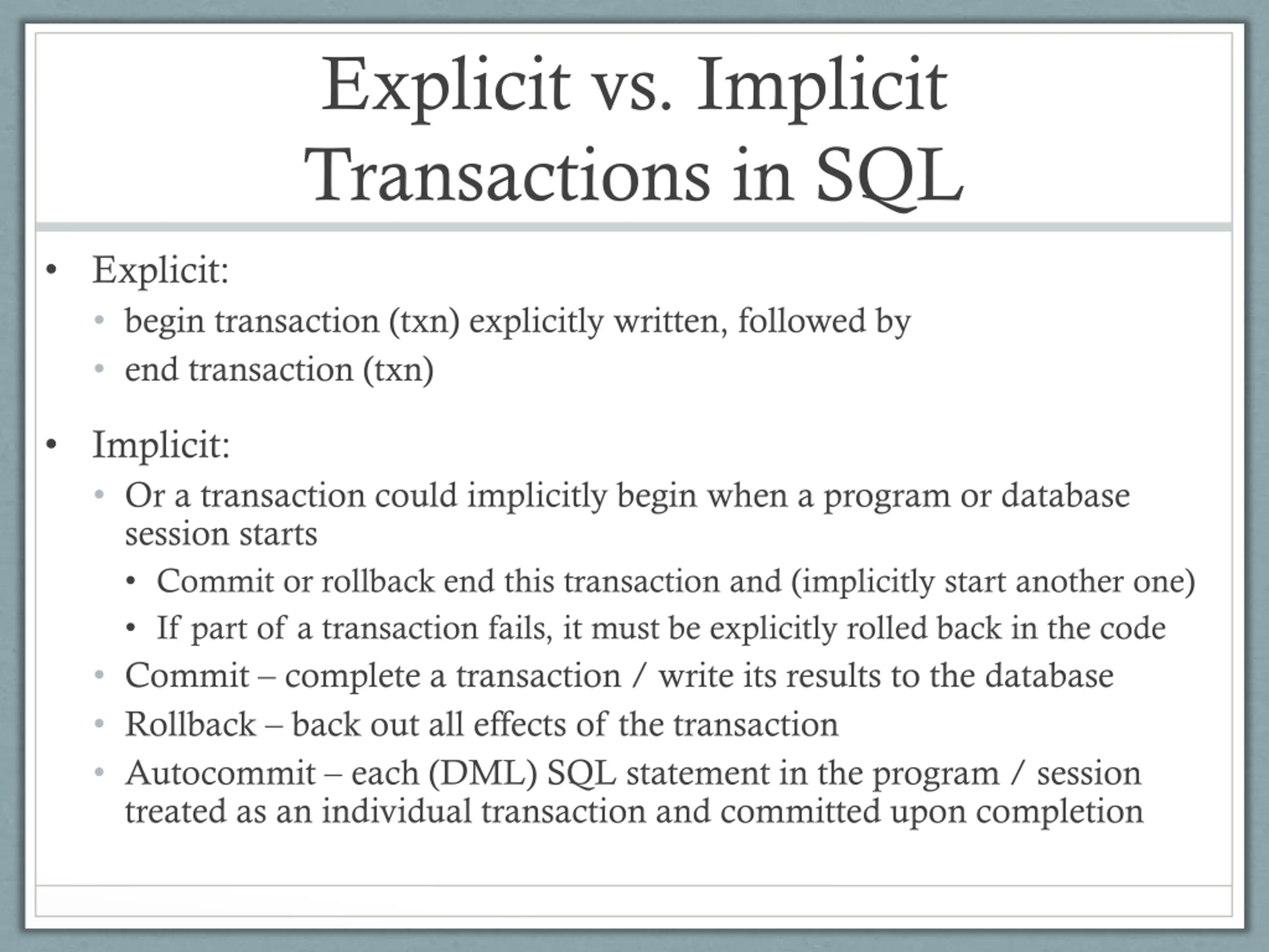 Explicit vs. Implicit Transactions in SQL Explicit: begin transaction (txn) explicitly written, followed by end transaction (txn) Implicit: Or a transaction could implicitly begin when a program or database session starts Commit or rollback end this transaction and (implicitly start another one) If part of a transaction fails, it must be explicitly rolled back in the code Commit complete a transaction / write its results to the database Rollback back out all effects of the transaction Autocommit each (DML) SQL statement in the program / session treated as an individual transaction and committed upon completion