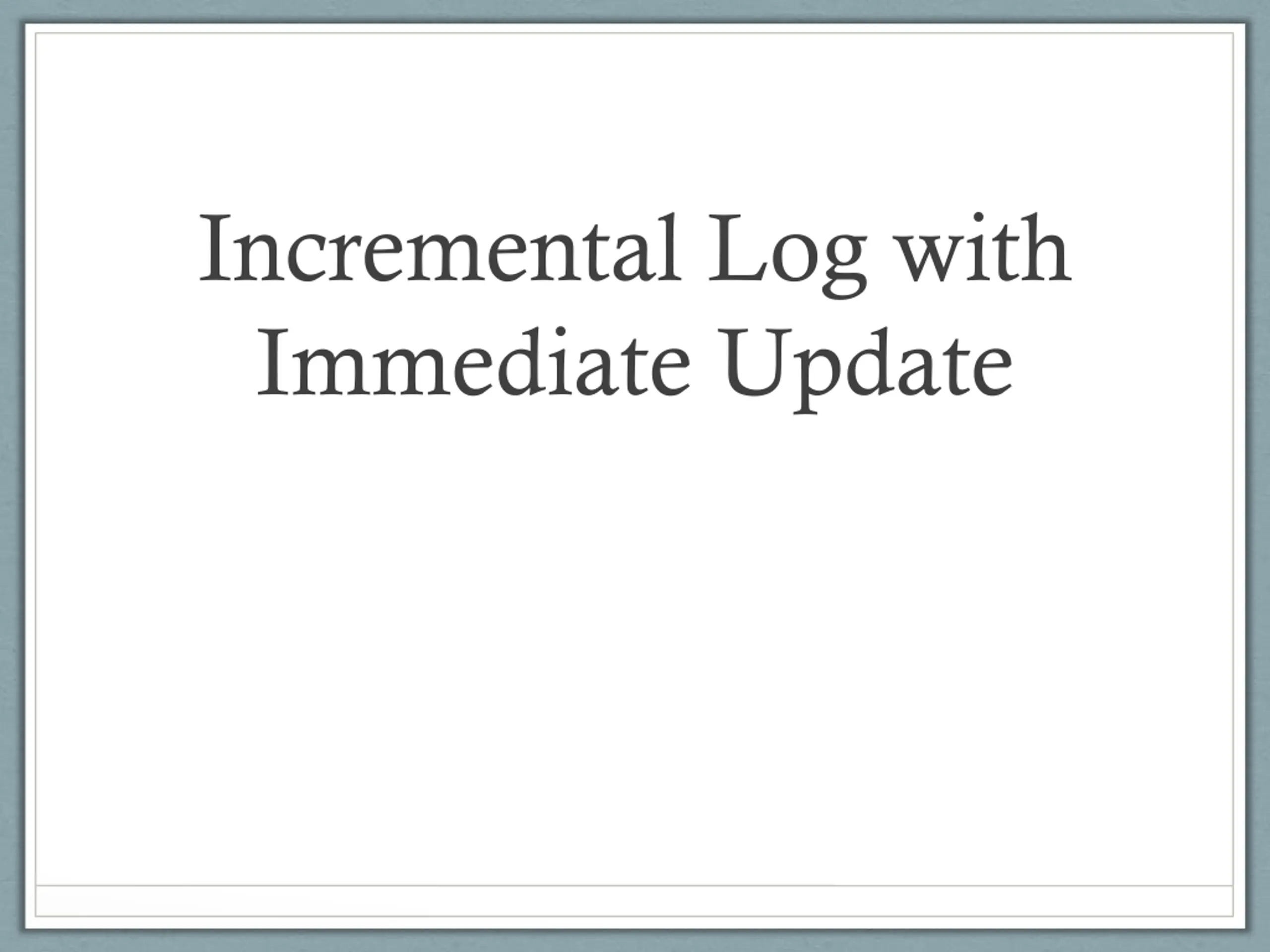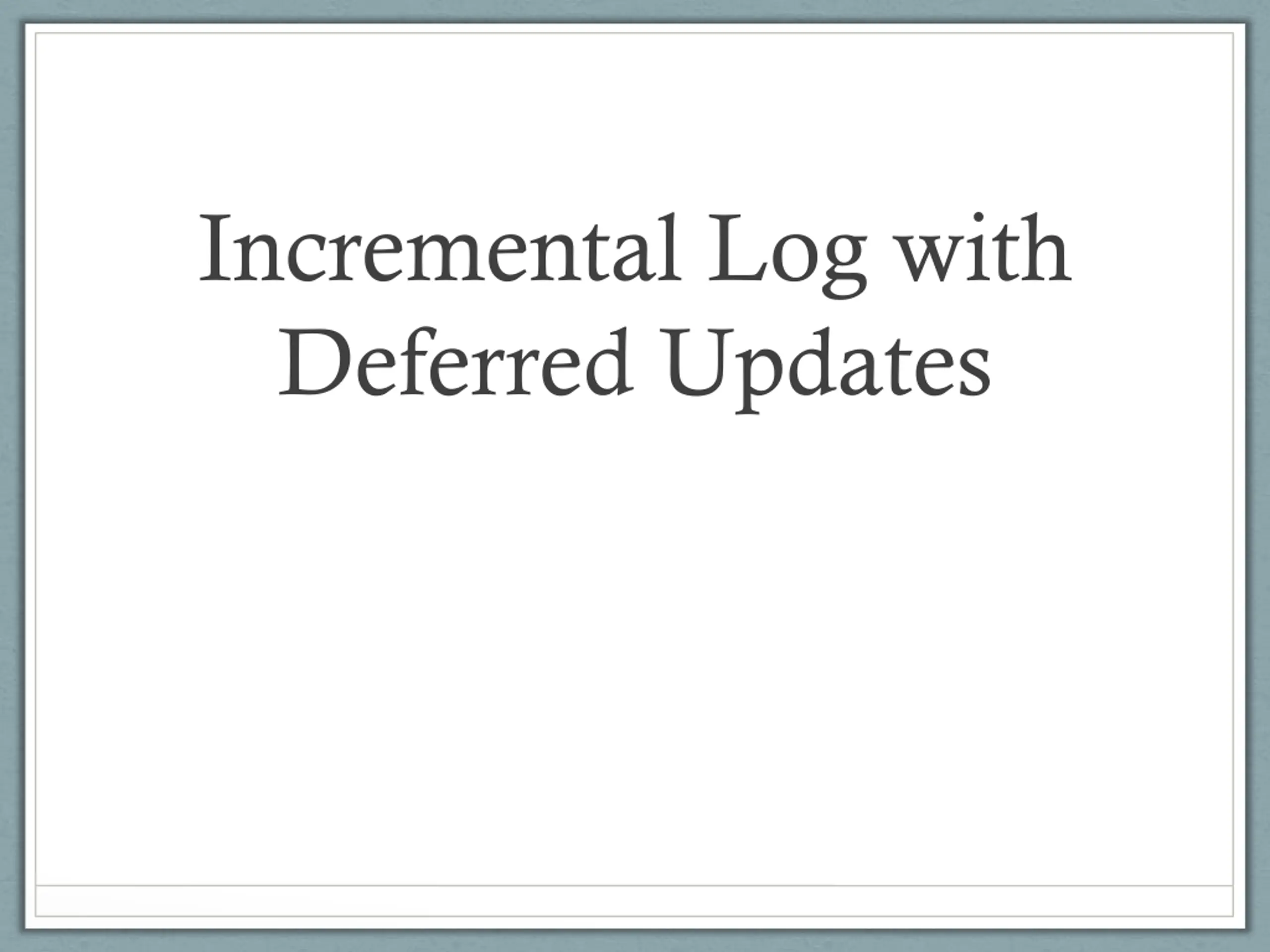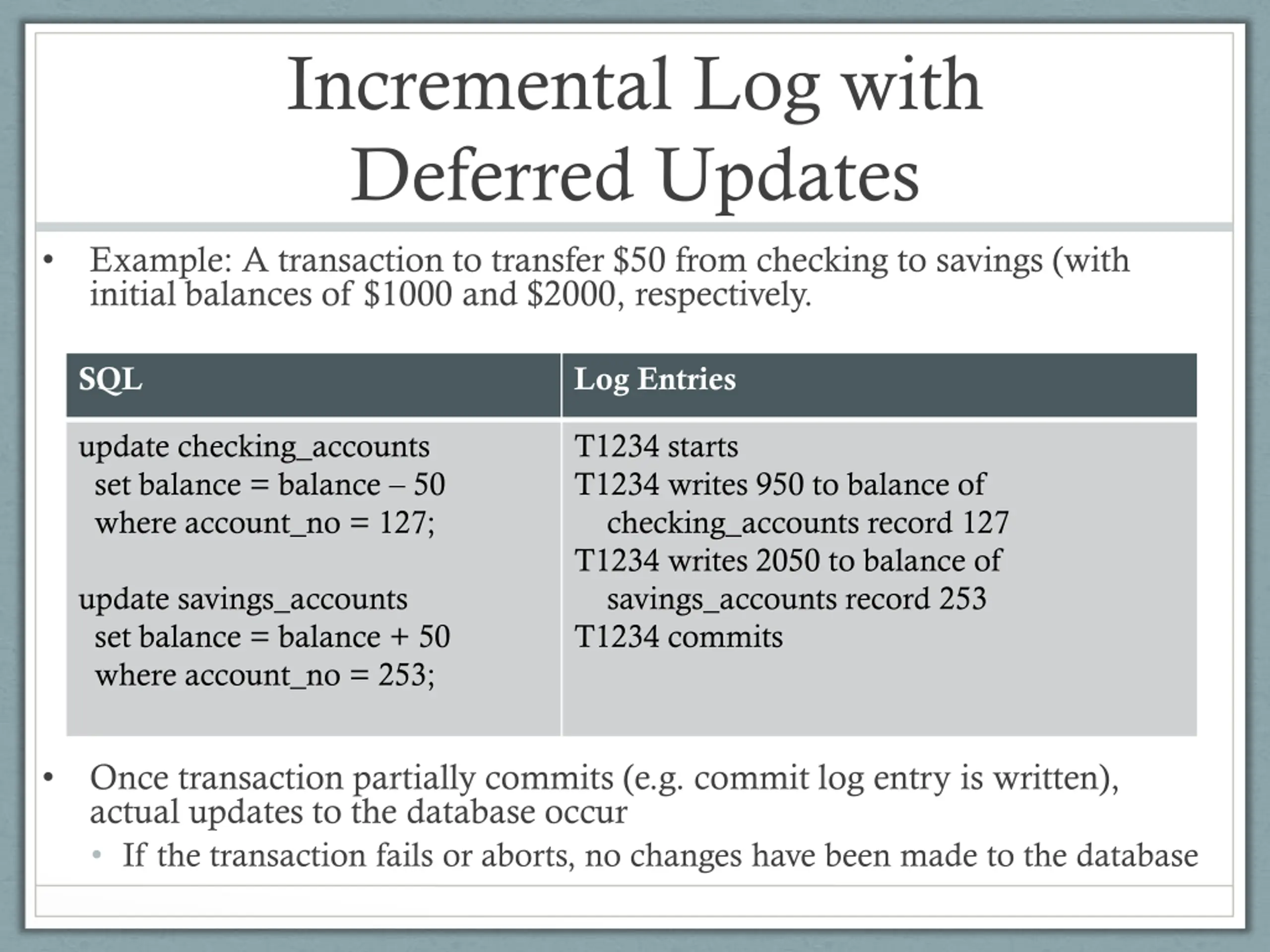 Incremental Log with Deferred Updates Example: A transaction to transfer $50 from checking to savings (with initial balances of $1000 and $2000, respectively. SQL Log Entries update checking_accounts set balance = balance 50 where account_no = 127; T1234 starts T1234 writes 950 to balance of checking_accounts record 127 T1234 writes 2050 to balance of savings_accounts record 253 T1234 commits update savings_accounts set balance = balance + 50 where account_no = 253; Once transaction partially commits (e.g. commit log entry is written), actual updates to the database occur If the transaction fails or aborts, no changes have been made to the database