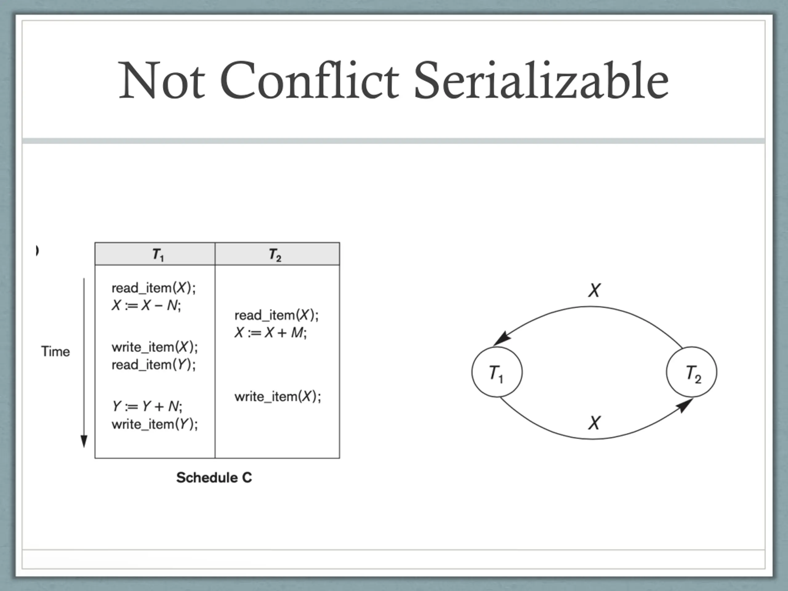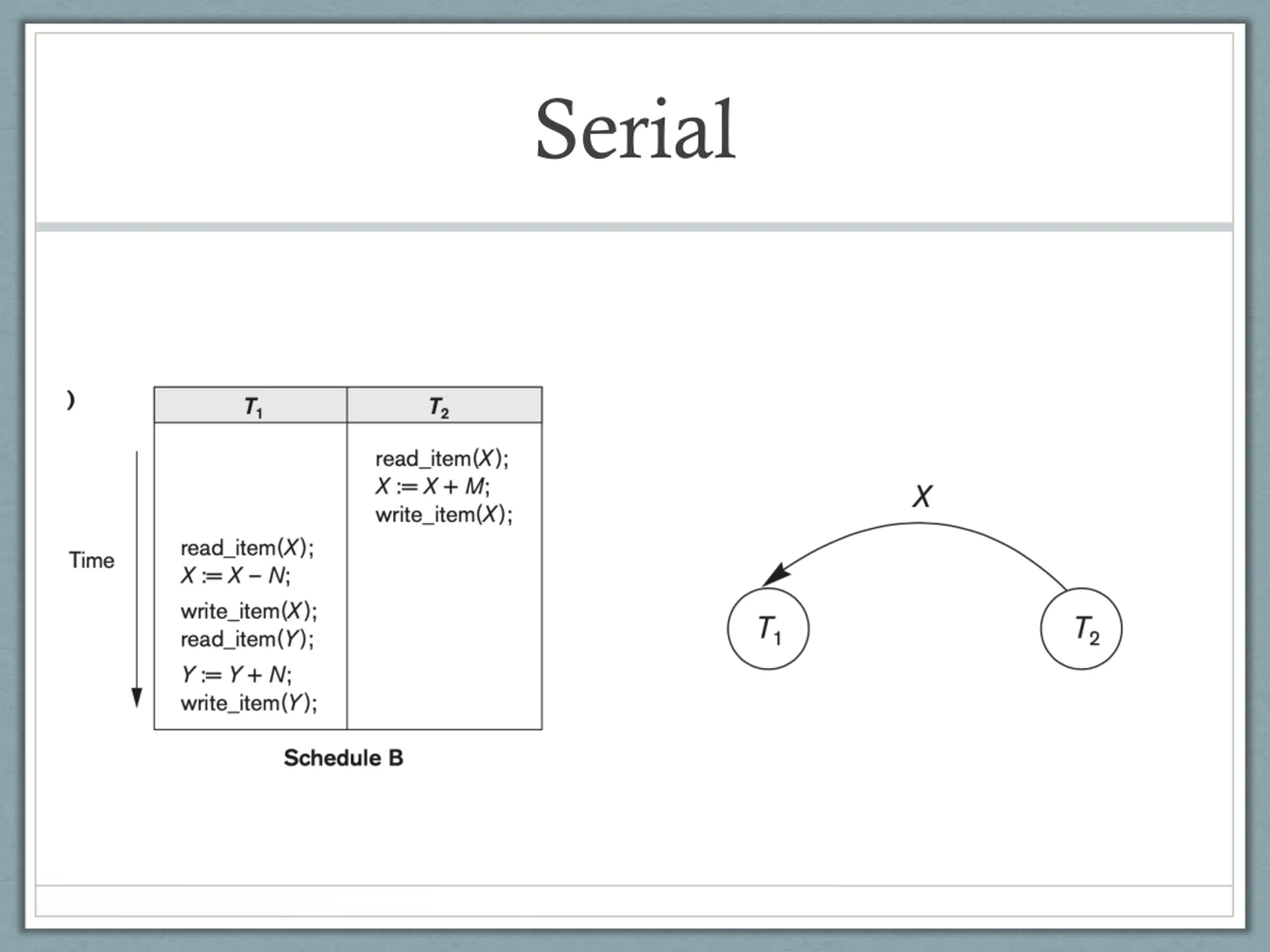 Precedence Graph Example 2 (Continued) Yields this precedence graph Acyclic indicates a serializable schedule T2 can be done before T1 Leads to the following conflict equivalent serial schedule Transfer (T1) Withdrawal (T2) read checking (1000) write checking (900) Final Balances read savings (2000) write savings (1950) read checking (900) write checking (950) 1950 (savings) 950 (checking)
