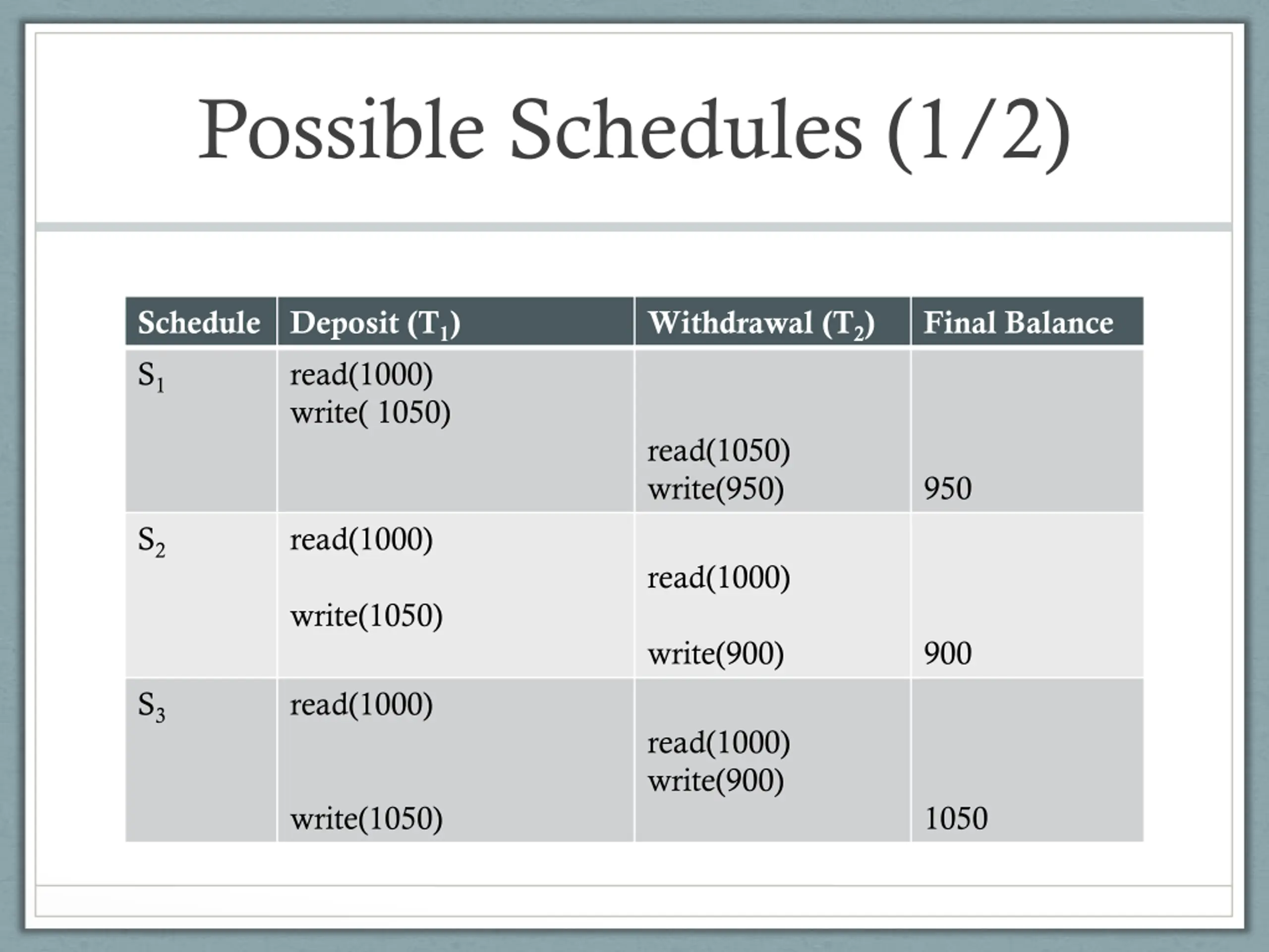 Possible Schedules (1/2) Schedule S1 Deposit (T1) read(1000) write( 1050) Withdrawal (T2) Final Balance read(1050) write(950) 950 S2 read(1000) read(1000) write(1050) write(900) 900 S3 read(1000) read(1000) write(900) write(1050) 1050