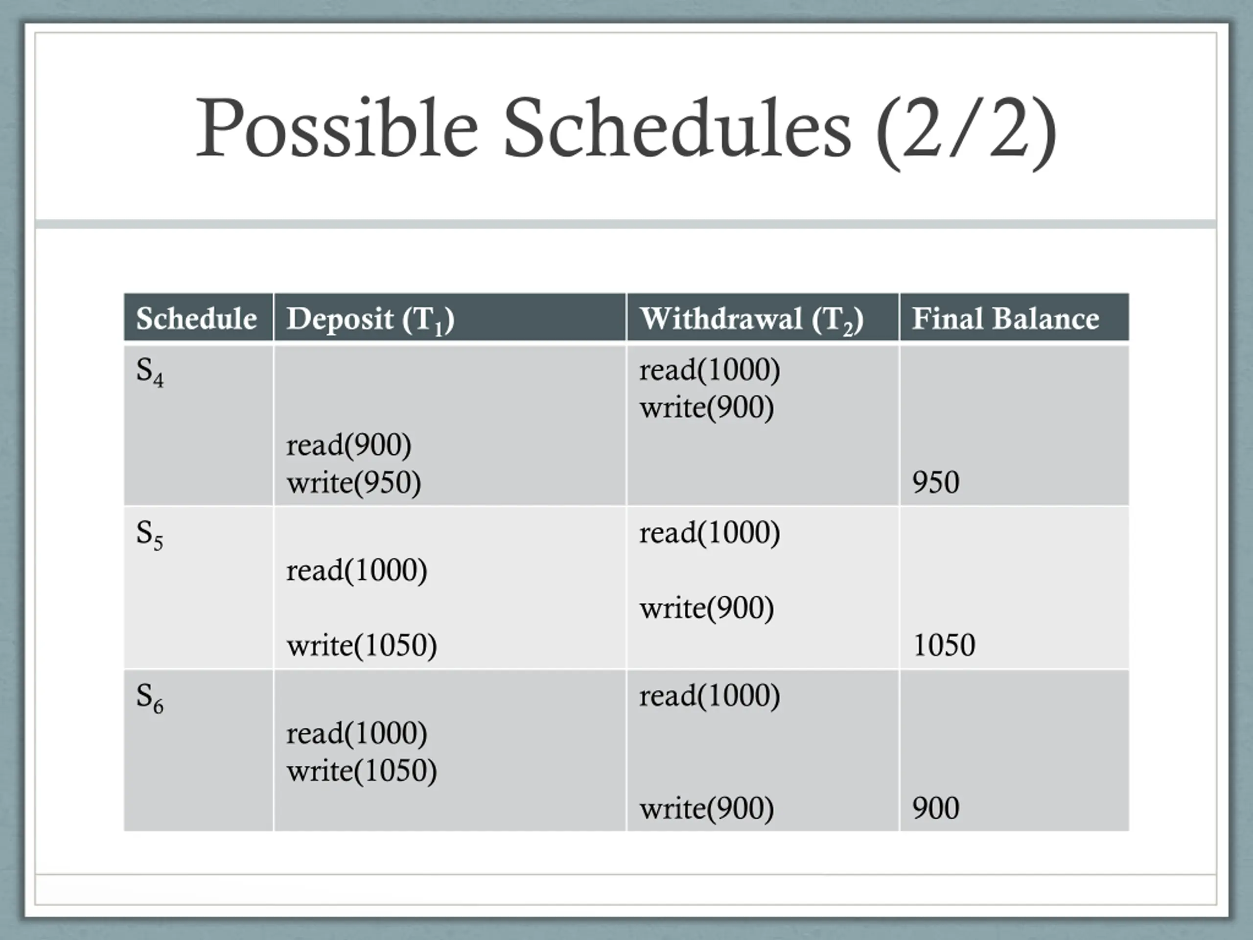 Possible Schedules (2/2) Schedule S4 Deposit (T1) Withdrawal (T2) read(1000) write(900) Final Balance read(900) write(950) 950 S5 read(1000) read(1000) write(900) write(1050) 1050 S6 read(1000) read(1000) write(1050) write(900) 900