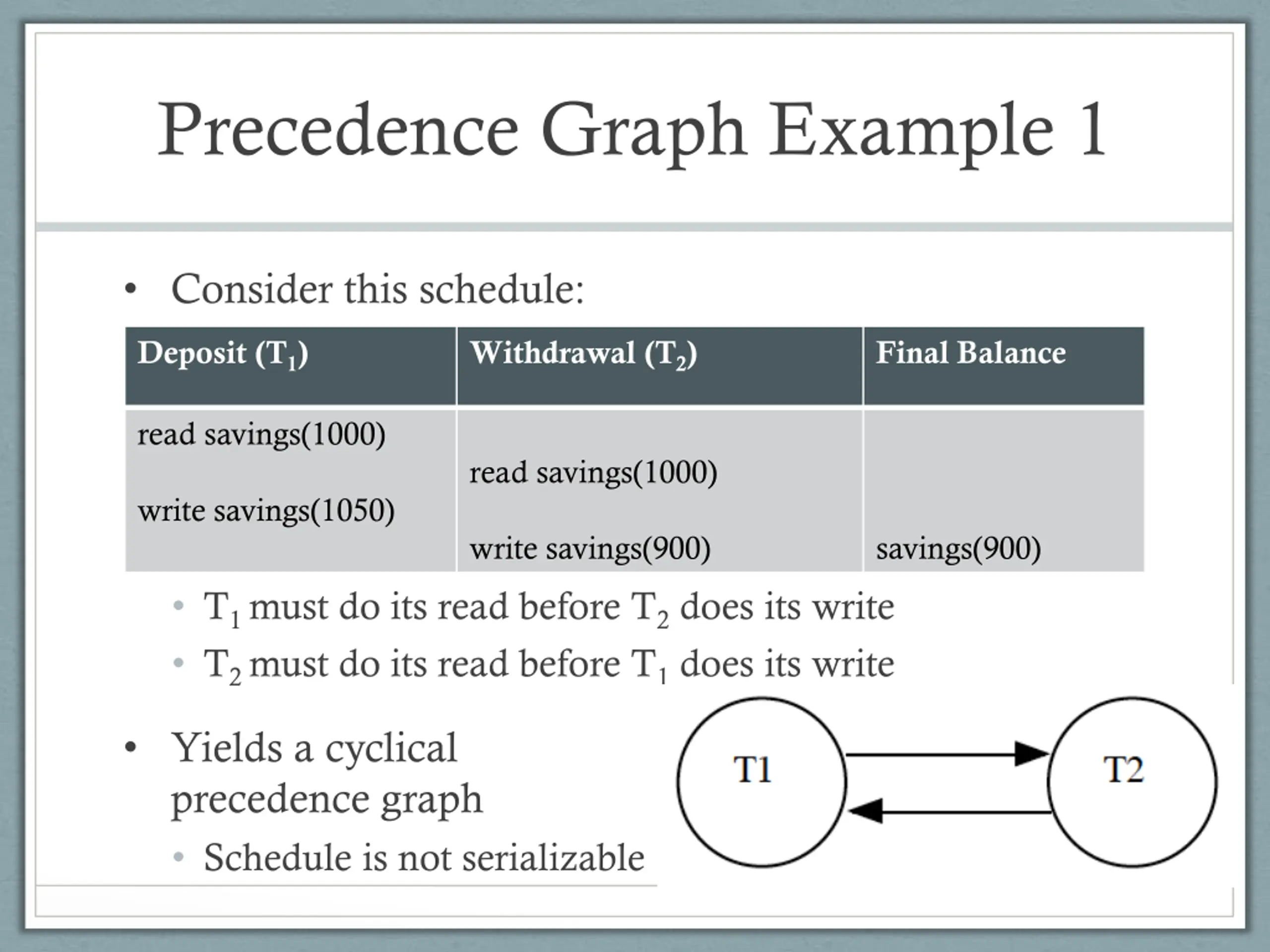 Precedence Graph Example 1 Consider this schedule: Deposit (T1) Withdrawal (T2) Final Balance read savings(1000) read savings(1000) write savings(1050) write savings(900) savings(900) T1 must do its read before T2 does its write T2 must do its read before T1 does its write Yields a cyclical precedence graph Schedule is not serializable