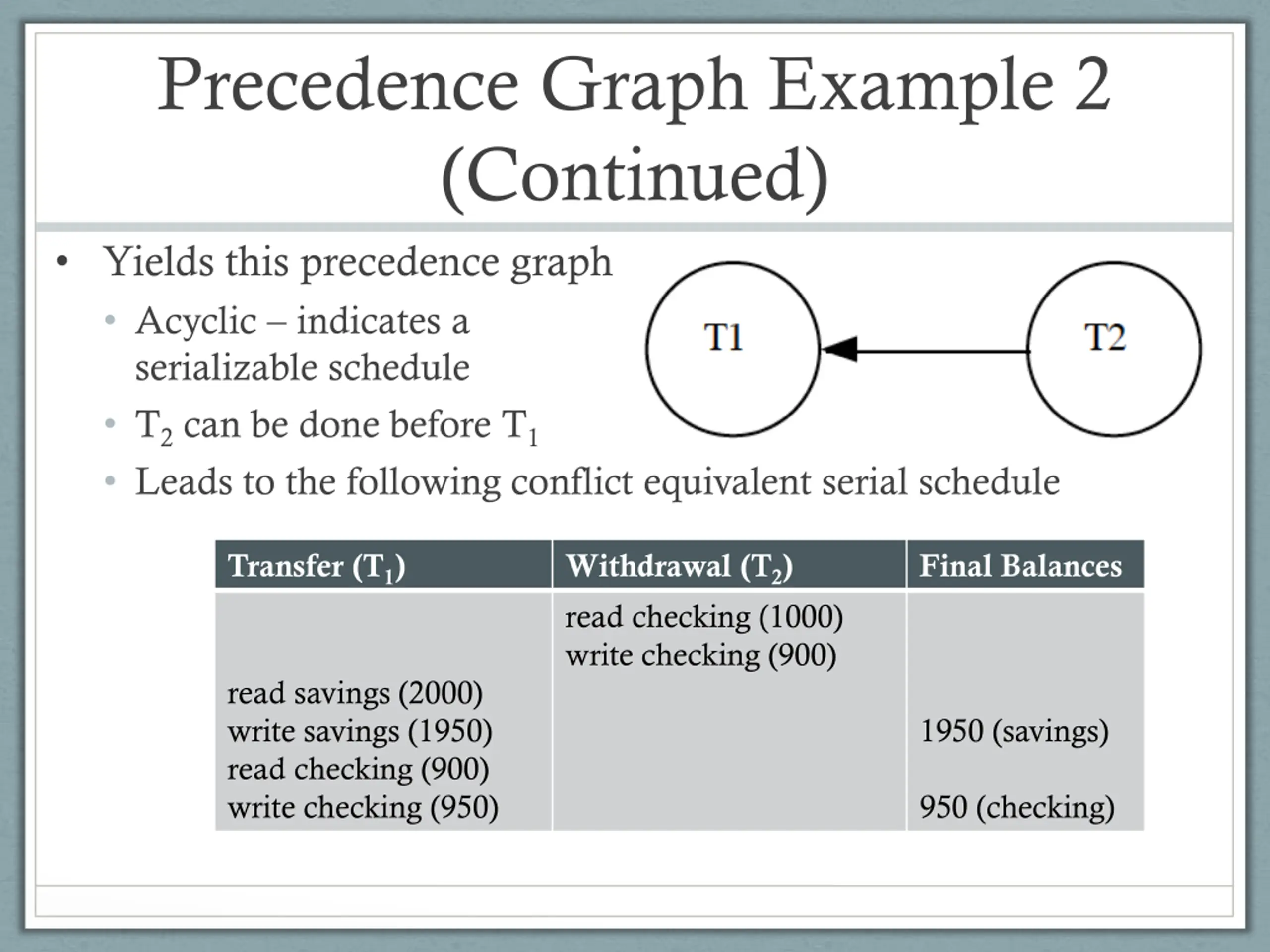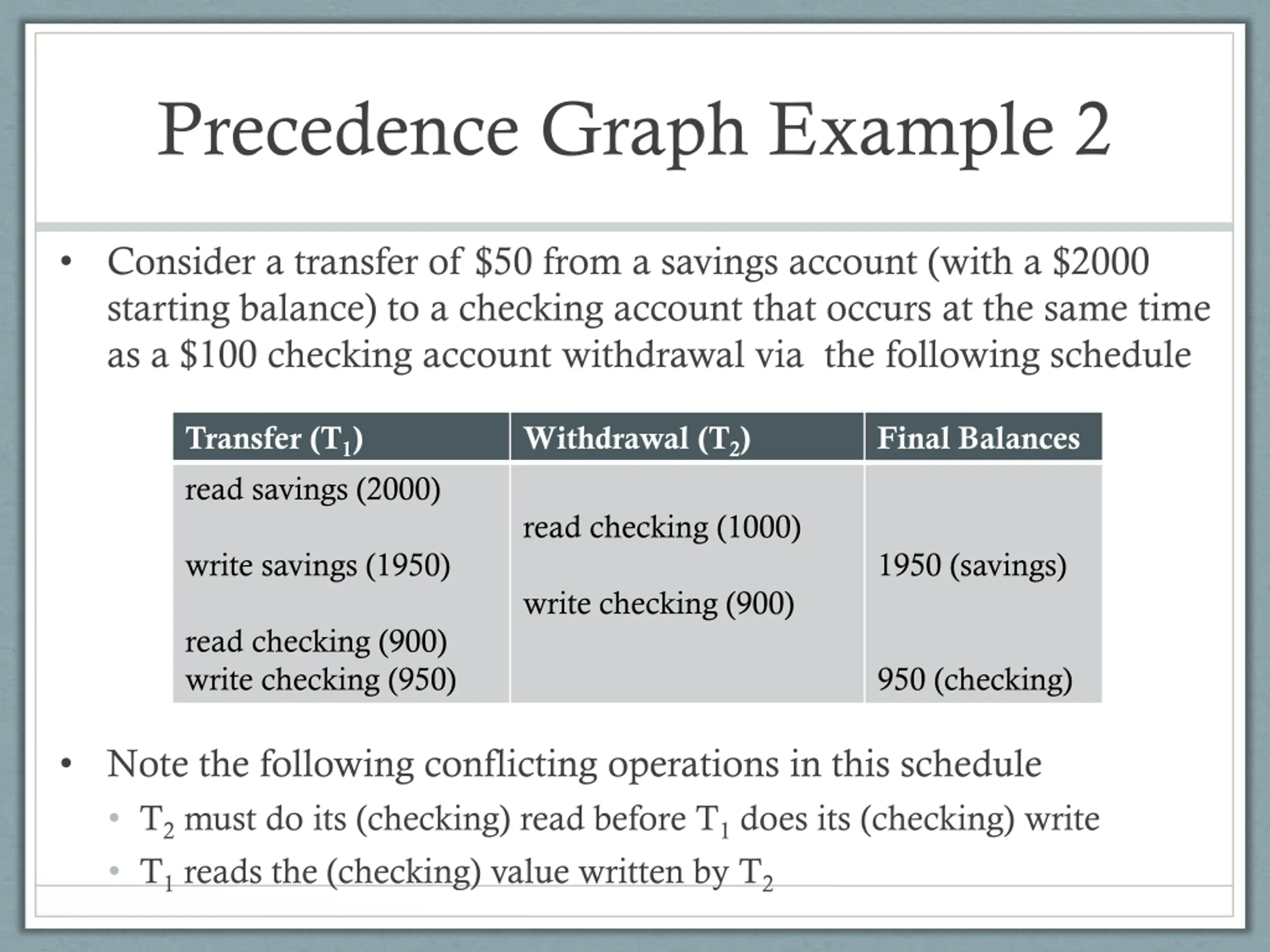 Precedence Graph Example 2 Consider a transfer of $50 from a savings account (with a $2000 starting balance) to a checking account that occurs at the same time as a $100 checking account withdrawal via the following schedule Transfer (T1) read savings (2000) Withdrawal (T2) Final Balances read checking (1000) write savings (1950) 1950 (savings) write checking (900) read checking (900) write checking (950) 950 (checking) Note the following conflicting operations in this schedule T2 must do its (checking) read before T1 does its (checking) write T1 reads the (checking) value written by T2