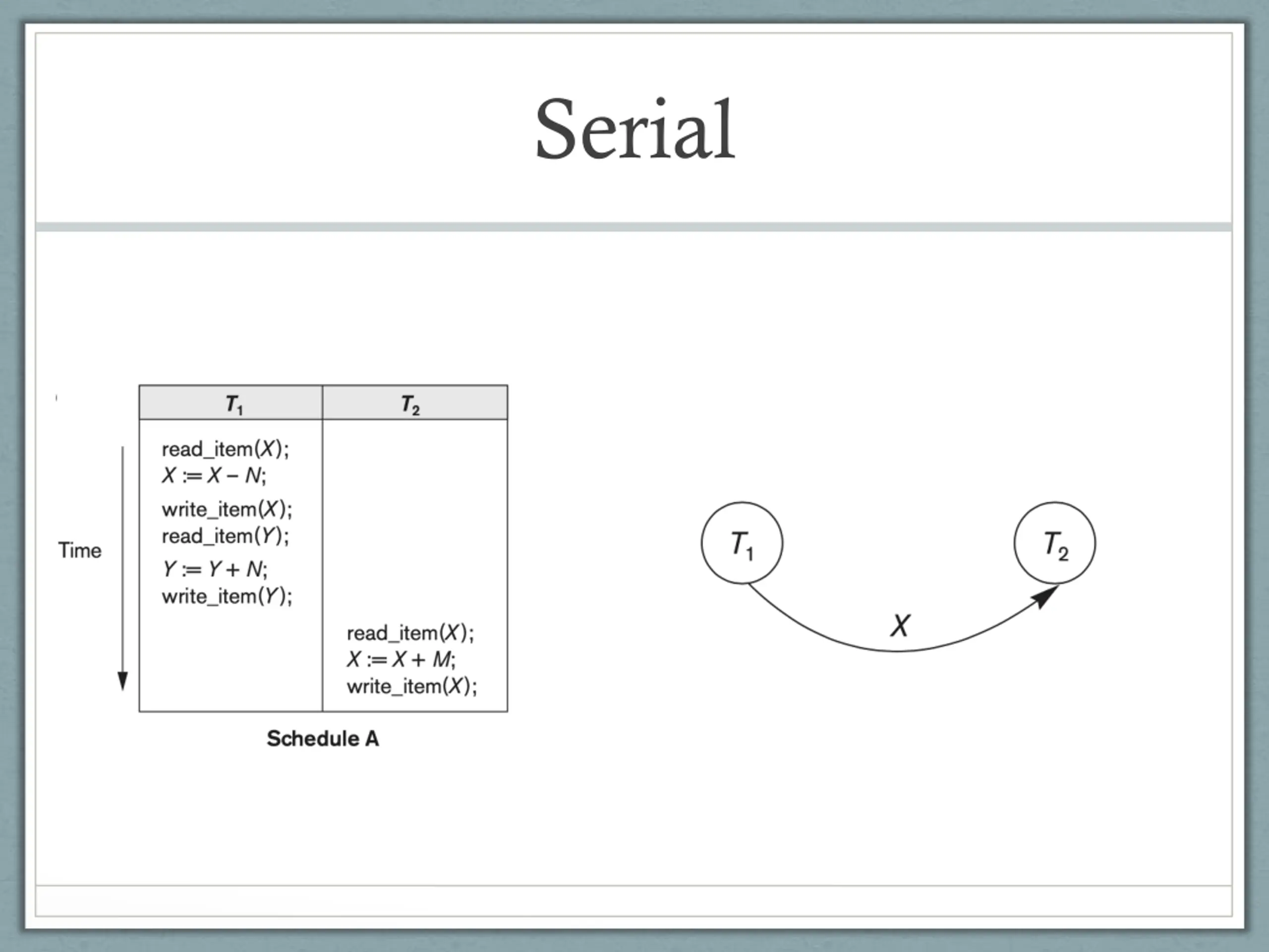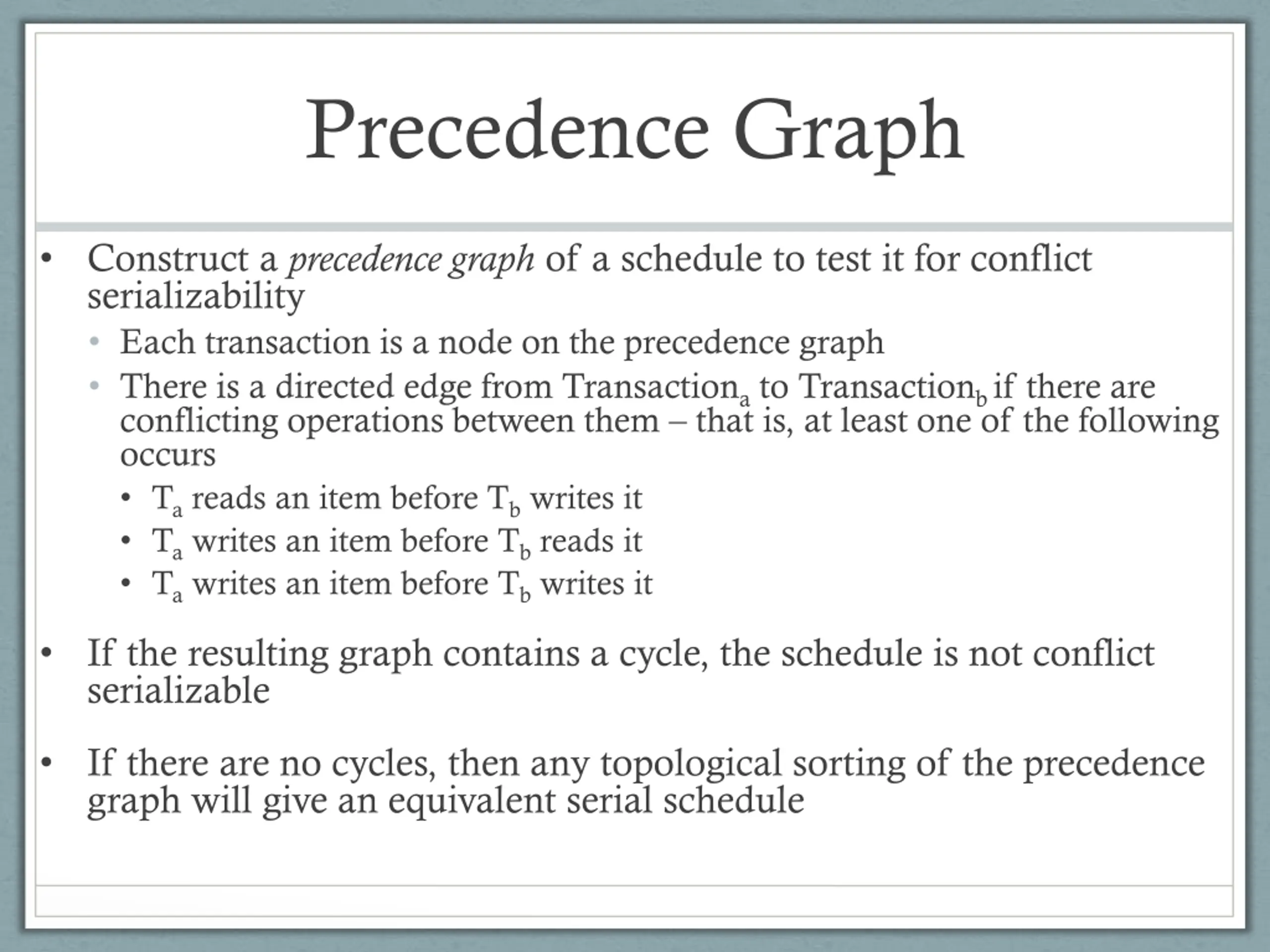 Precedence Graph Construct a precedence graph of a schedule to test it for conflict serializability Each transaction is a node on the precedence graph There is a directed edge from Transactiona to Transactionb if there are conflicting operations between them that is, at least one of the following occurs Ta reads an item before Tb writes it Ta writes an item before Tb reads it Ta writes an item before Tb writes it If the resulting graph contains a cycle, the schedule is not conflict serializable If there are no cycles, then any topological sorting of the precedence graph will give an equivalent serial schedule