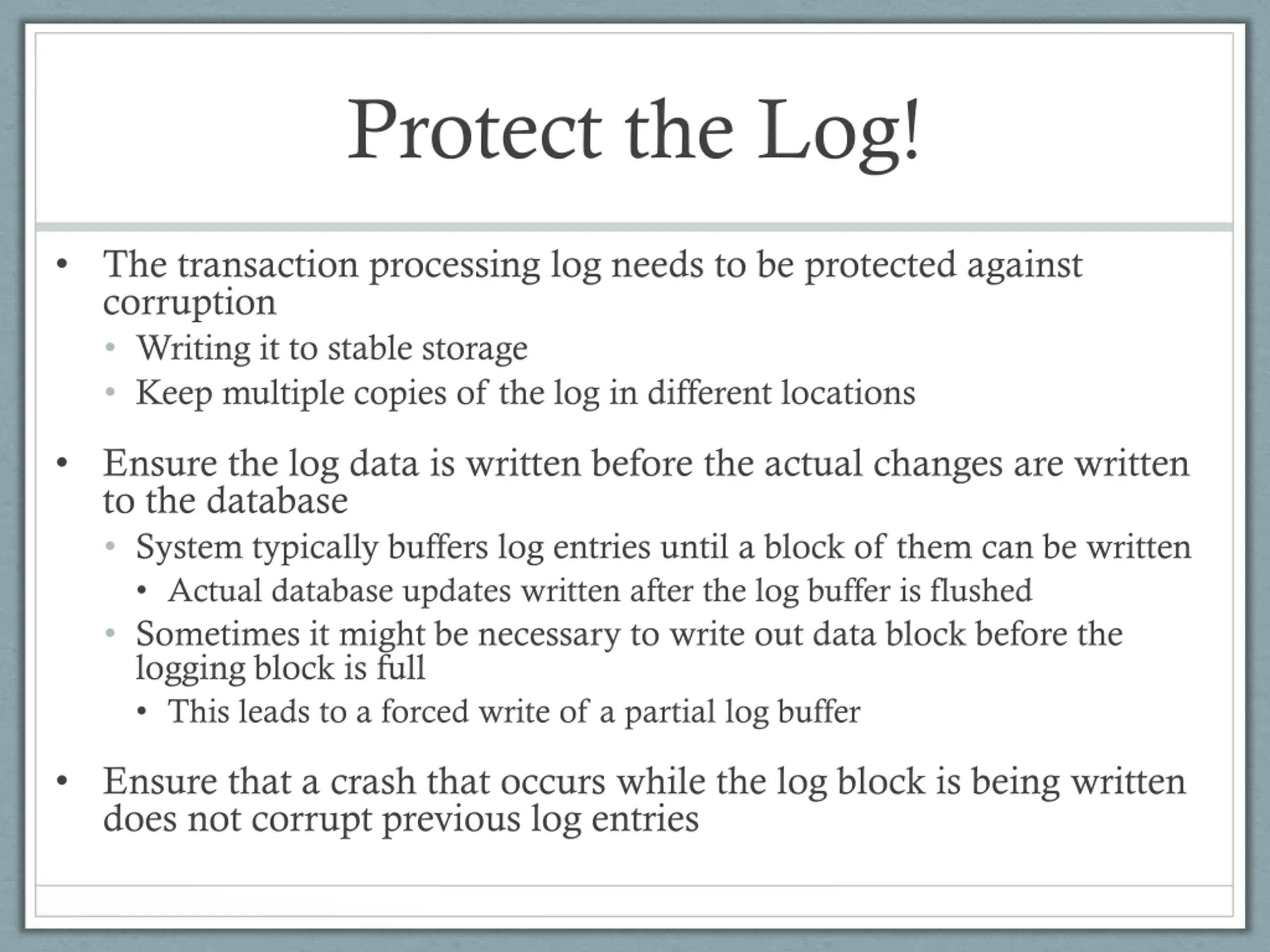 Protect the Log! The transaction processing log needs to be protected against corruption Writing it to stable storage Keep multiple copies of the log in different locations Ensure the log data is written before the actual changes are written to the database System typically buffers log entries until a block of them can be written Actual database updates written after the log buffer is flushed Sometimes it might be necessary to write out data block before the logging block is full This leads to a forced write of a partial log buffer Ensure that a crash that occurs while the log block is being written does not corrupt previous log entries