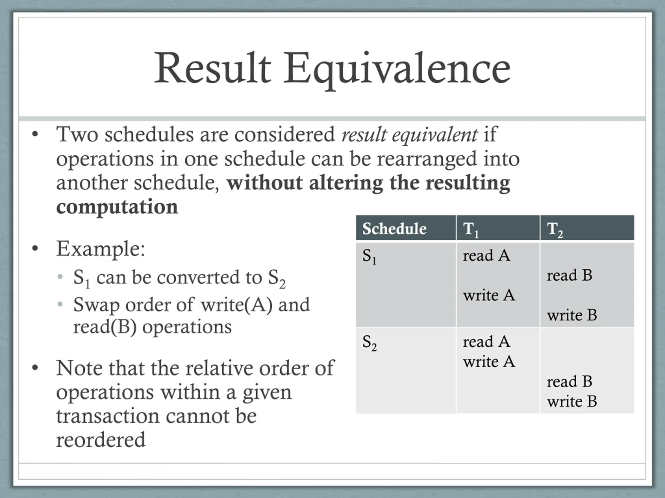 Result Equivalence Two schedules are considered result equivalent if operations in one schedule can be rearranged into another schedule, without altering the resulting computation Schedule S1 T1 read A T2 Example: S1 can be converted to S2 Swap order of write(A) and read(B) operations read B write A write B S2 read A write A Note that the relative order of operations within a given transaction cannot be reordered read B write B