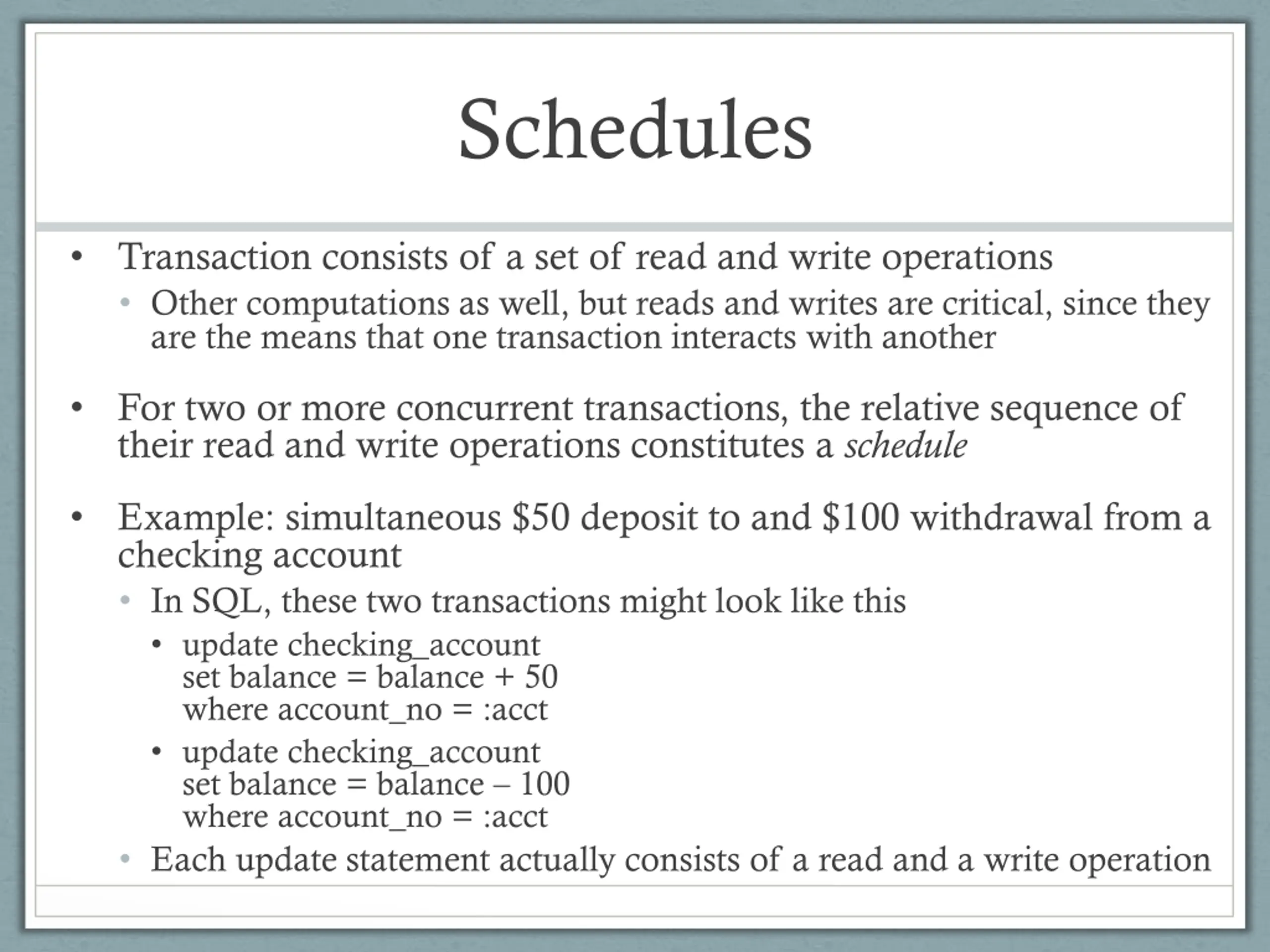 Schedules Transaction consists of a set of read and write operations Other computations as well, but reads and writes are critical, since they are the means that one transaction interacts with another For two or more concurrent transactions, the relative sequence of their read and write operations constitutes a schedule Example: simultaneous $50 deposit to and $100 withdrawal from a checking account In SQL, these two transactions might look like this update checking_account set balance = balance + 50 where account_no = :acct update checking_account set balance = balance 100 where account_no = :acct Each update statement actually consists of a read and a write operation