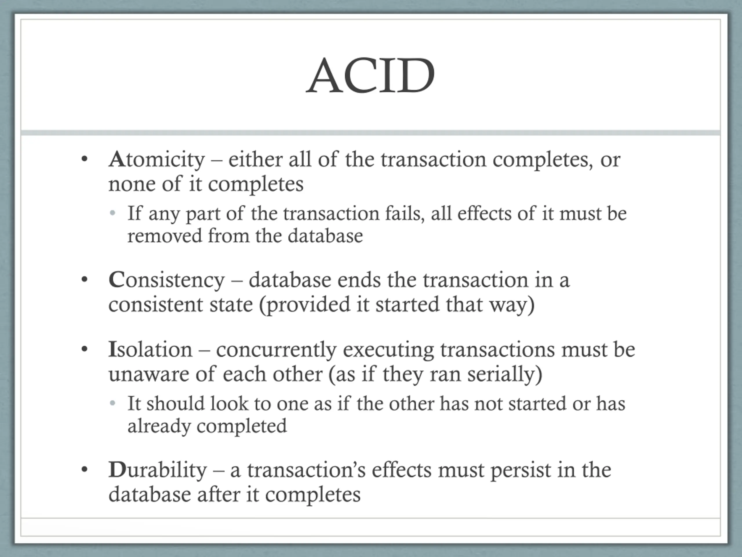 ACID Atomicity either all of the transaction completes, or none of it completes If any part of the transaction fails, all effects of it must be removed from the database Consistency database ends the transaction in a consistent state (provided it started that way) Isolation concurrently executing transactions must be unaware of each other (as if they ran serially) It should look to one as if the other has not started or has already completed Durability a transaction s effects must persist in the database after it completes