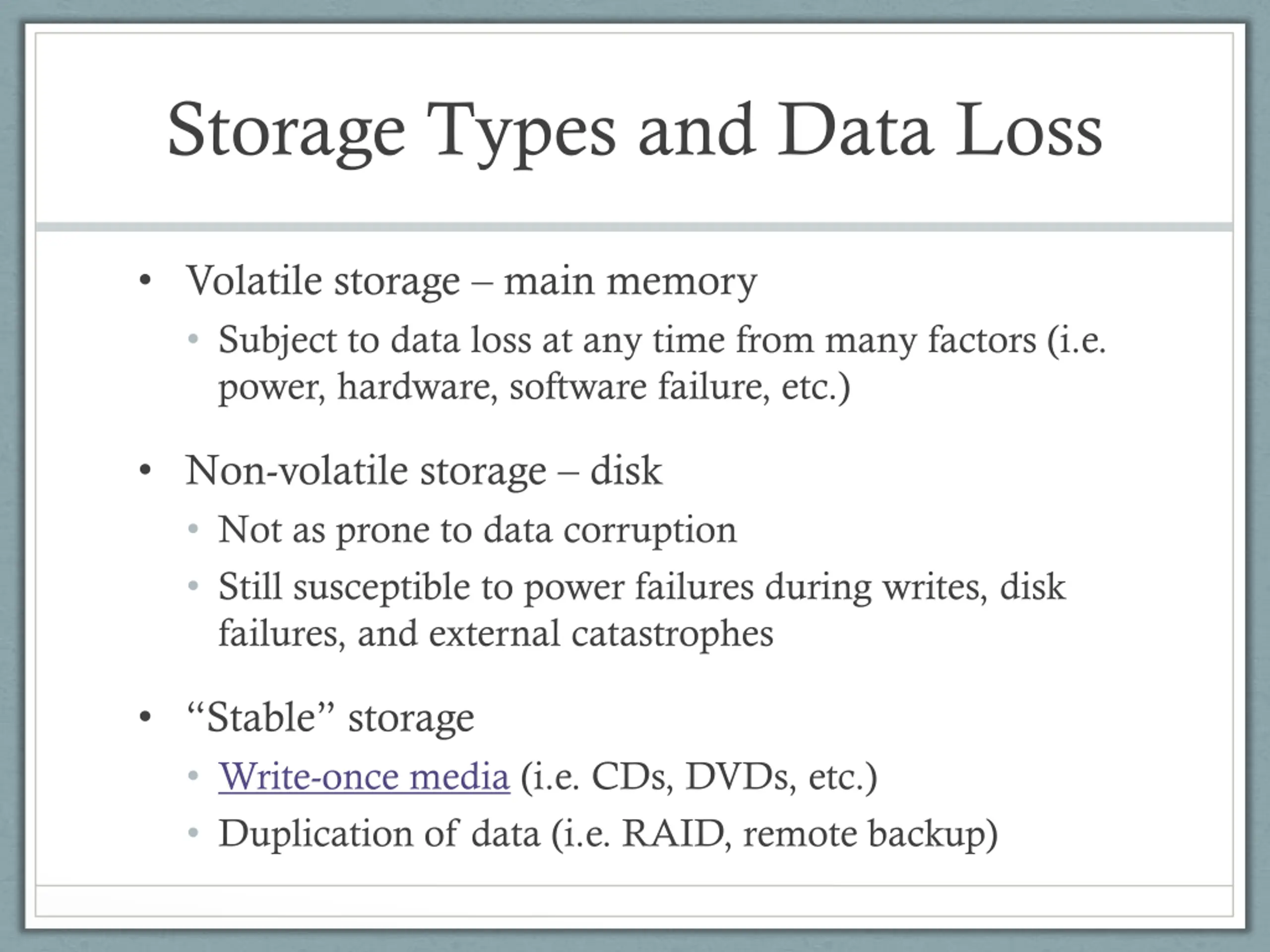 Storage Types and Data Loss Volatile storage main memory Subject to data loss at any time from many factors (i.e. power, hardware, software failure, etc.) Non-volatile storage disk Not as prone to data corruption Still susceptible to power failures during writes, disk failures, and external catastrophes Stable storage Write-once media (i.e. CDs, DVDs, etc.) Duplication of data (i.e. RAID, remote backup)