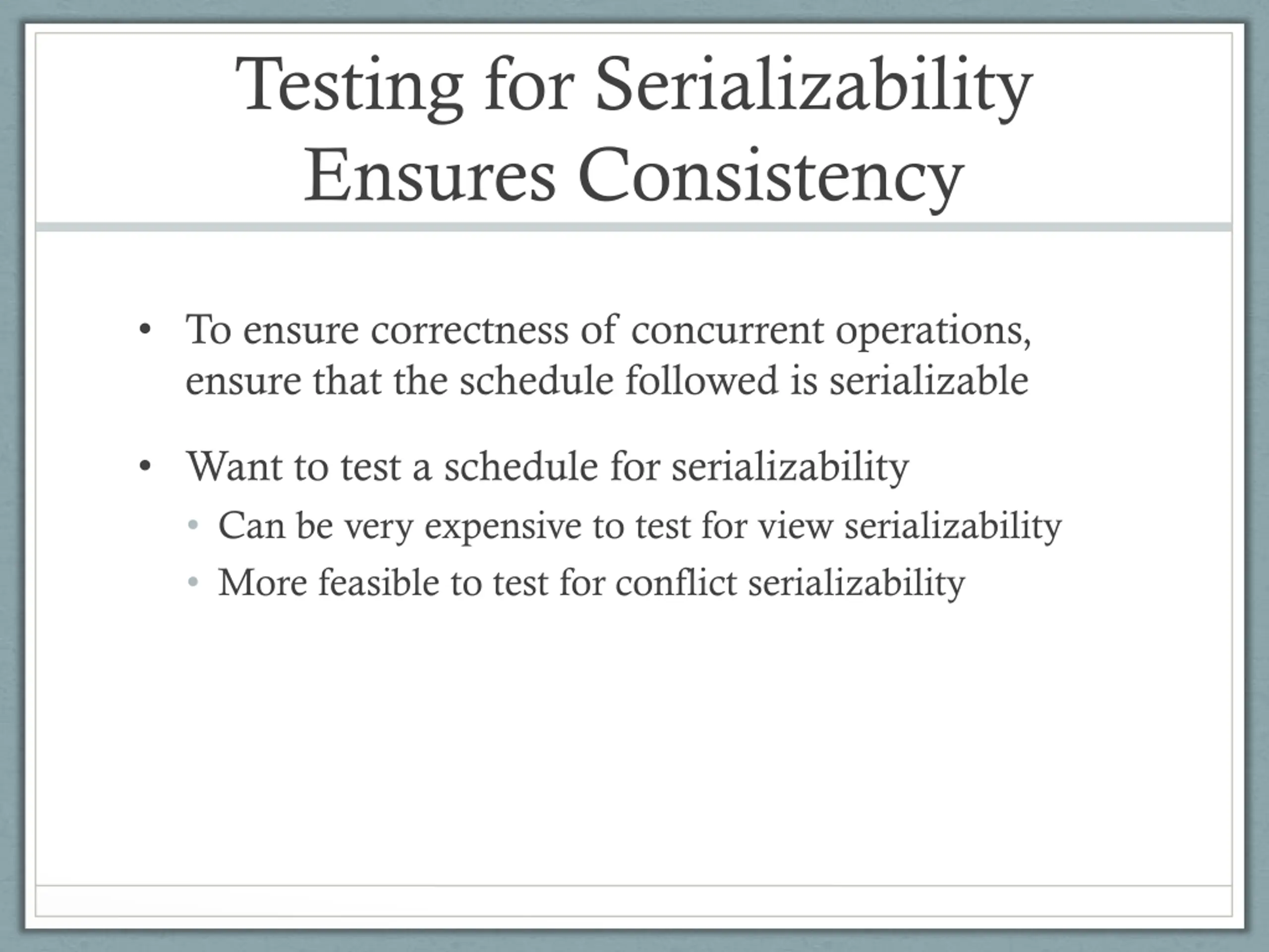 Testing for Serializability Ensures Consistency To ensure correctness of concurrent operations, ensure that the schedule followed is serializable Want to test a schedule for serializability Can be very expensive to test for view serializability More feasible to test for conflict serializability