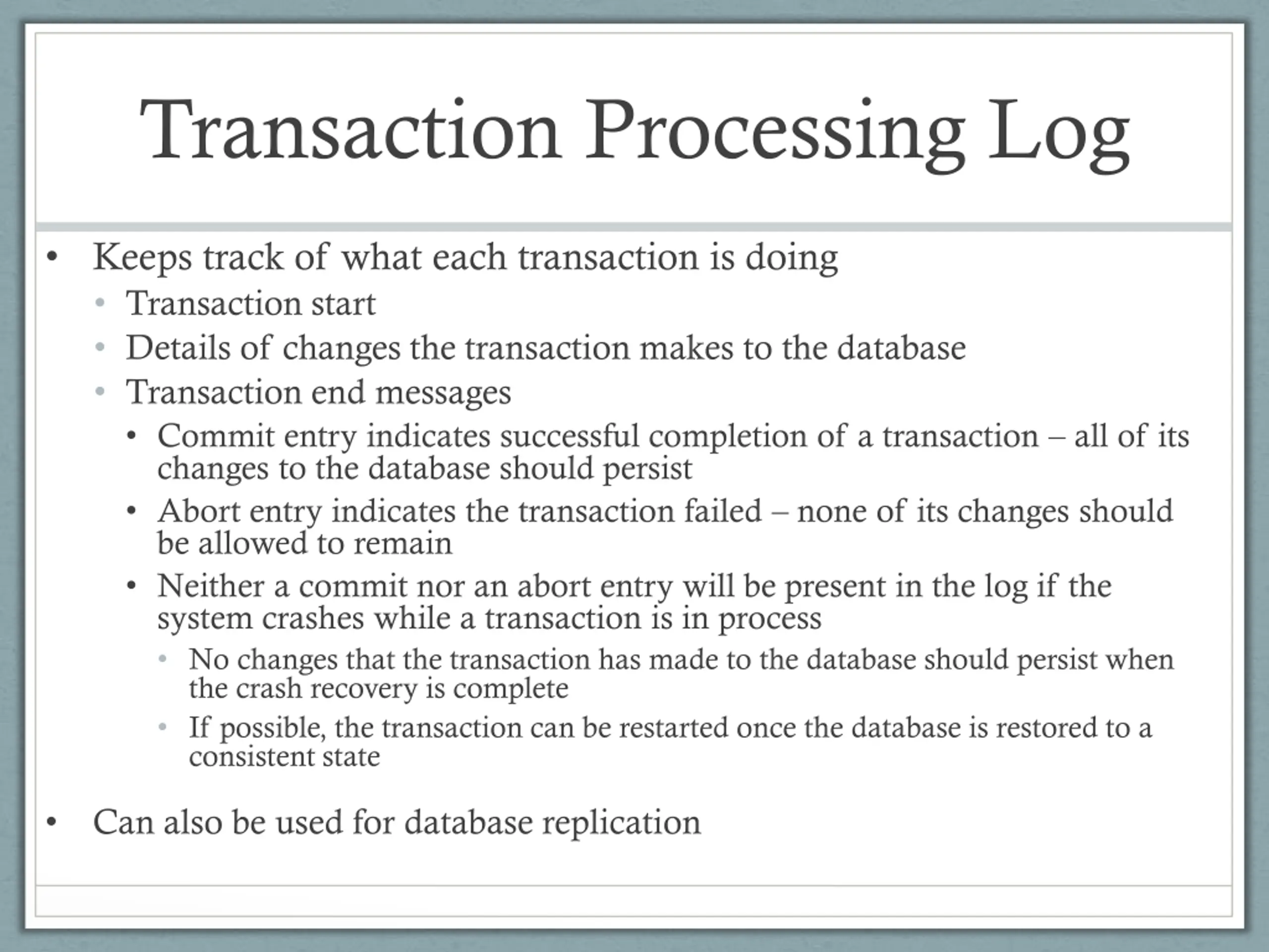 Transaction Processing Log Keeps track of what each transaction is doing Transaction start Details of changes the transaction makes to the database Transaction end messages Commit entry indicates successful completion of a transaction all of its changes to the database should persist Abort entry indicates the transaction failed none of its changes should be allowed to remain Neither a commit nor an abort entry will be present in the log if the system crashes while a transaction is in process No changes that the transaction has made to the database should persist when the crash recovery is complete If possible, the transaction can be restarted once the database is restored to a consistent state Can also be used for database replication