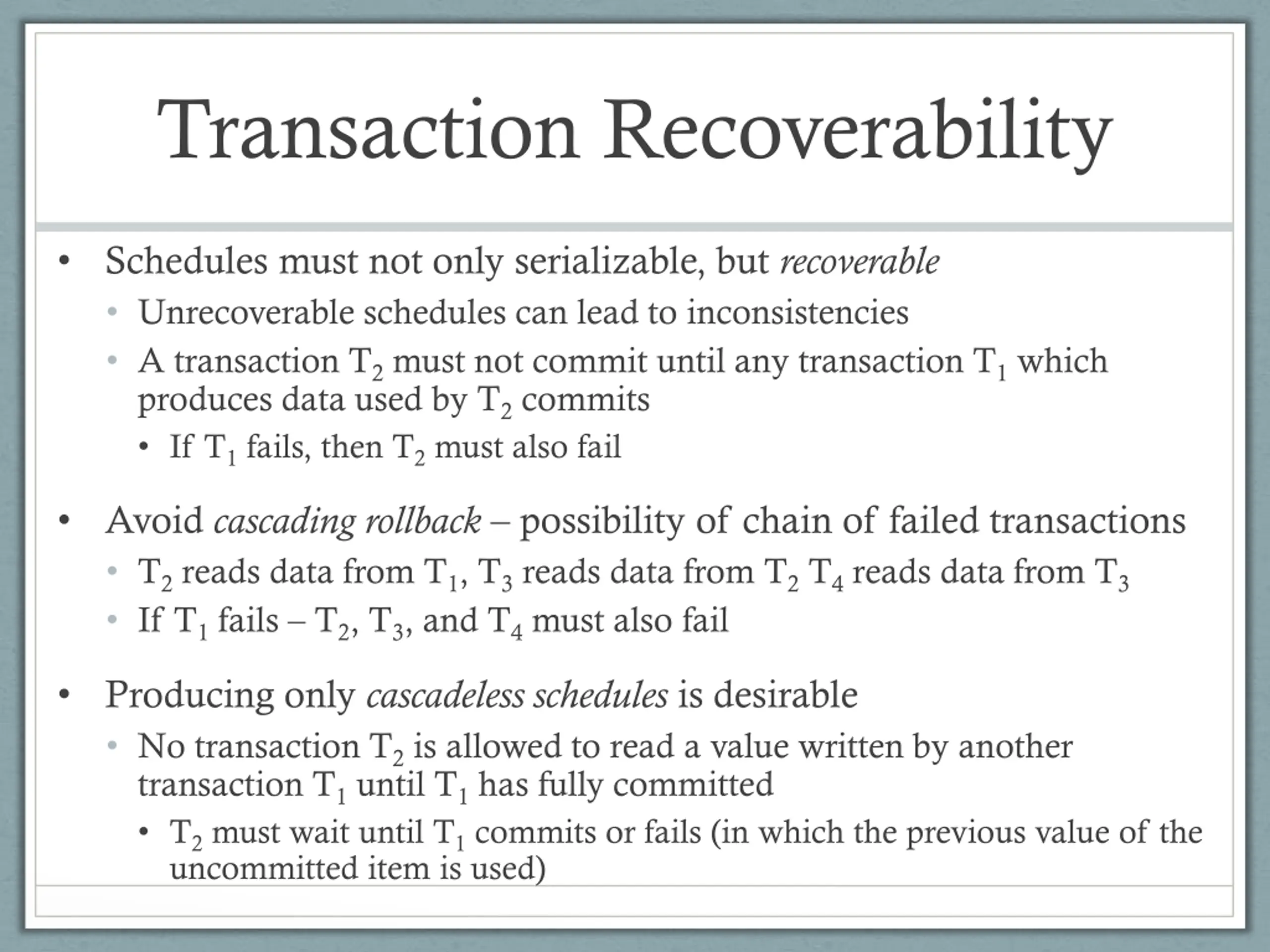 Transaction Recoverability Schedules must not only serializable, but recoverable Unrecoverable schedules can lead to inconsistencies A transaction T2 must not commit until any transaction T1 which produces data used by T2 commits If T1 fails, then T2 must also fail Avoid cascading rollback possibility of chain of failed transactions T2 reads data from T1, T3 reads data from T2 T4 reads data from T3 If T1 fails T2, T3, and T4 must also fail Producing only cascadeless schedules is desirable No transaction T2 is allowed to read a value written by another transaction T1 until T1 has fully committed T2 must wait until T1 commits or fails (in which the previous value of the uncommitted item is used)