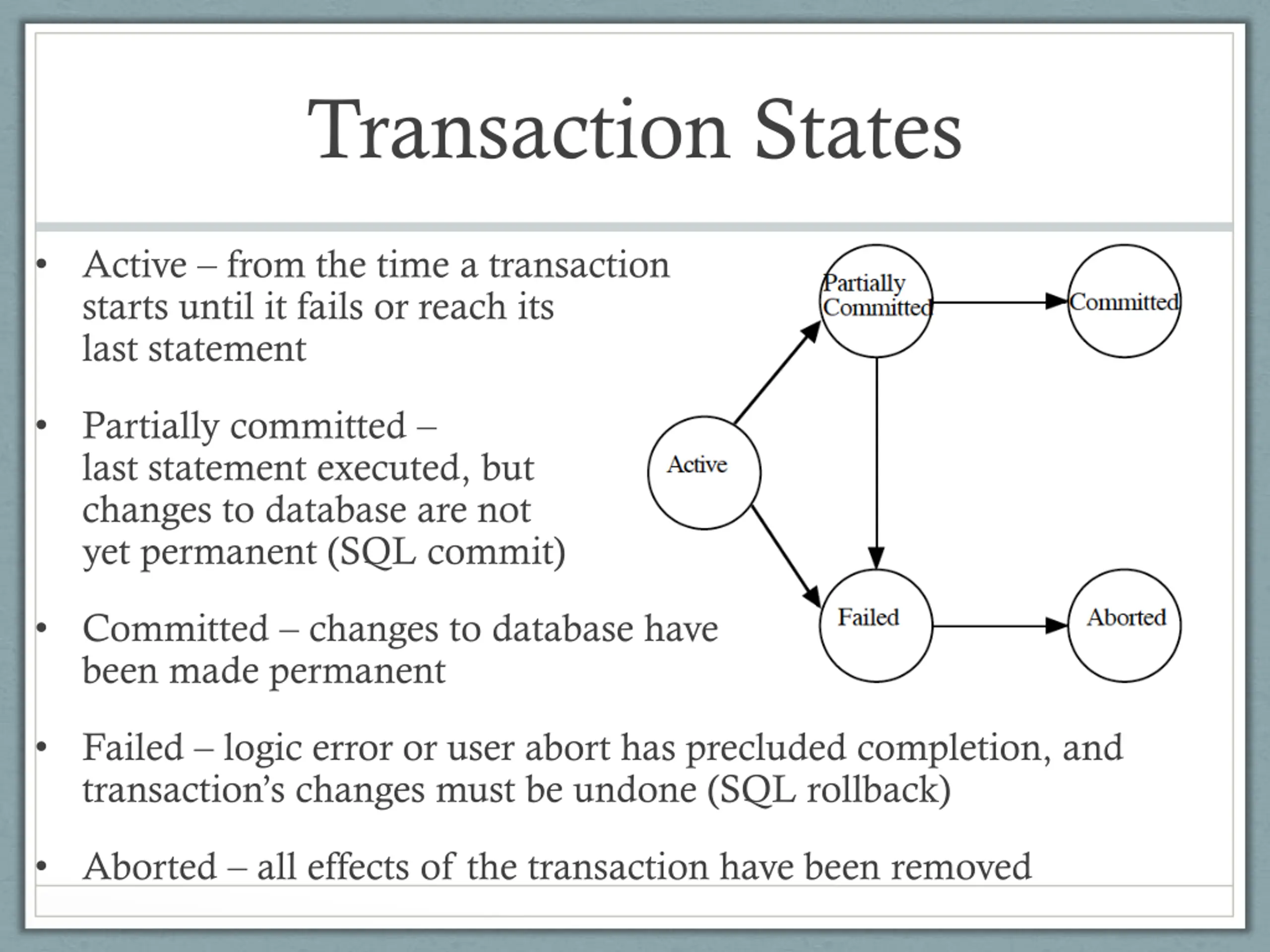 Transaction States Active from the time a transaction starts until it fails or reach its last statement Partially committed last statement executed, but changes to database are not yet permanent (SQL commit) Committed changes to database have been made permanent Failed logic error or user abort has precluded completion, and transaction s changes must be undone (SQL rollback) Aborted all effects of the transaction have been removed
