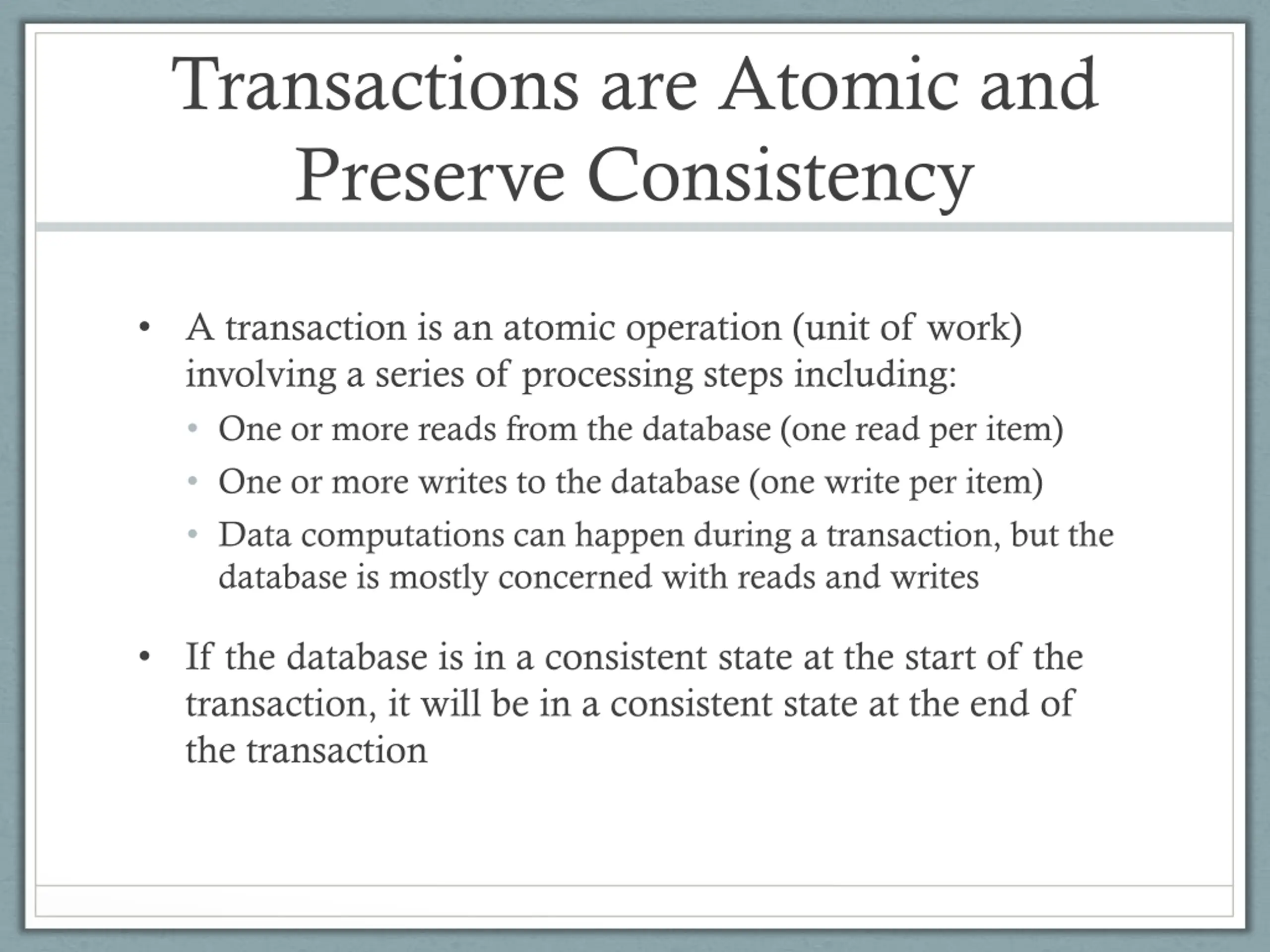 Transactions are Atomic and Preserve Consistency A transaction is an atomic operation (unit of work) involving a series of processing steps including: One or more reads from the database (one read per item) One or more writes to the database (one write per item) Data computations can happen during a transaction, but the database is mostly concerned with reads and writes If the database is in a consistent state at the start of the transaction, it will be in a consistent state at the end of the transaction