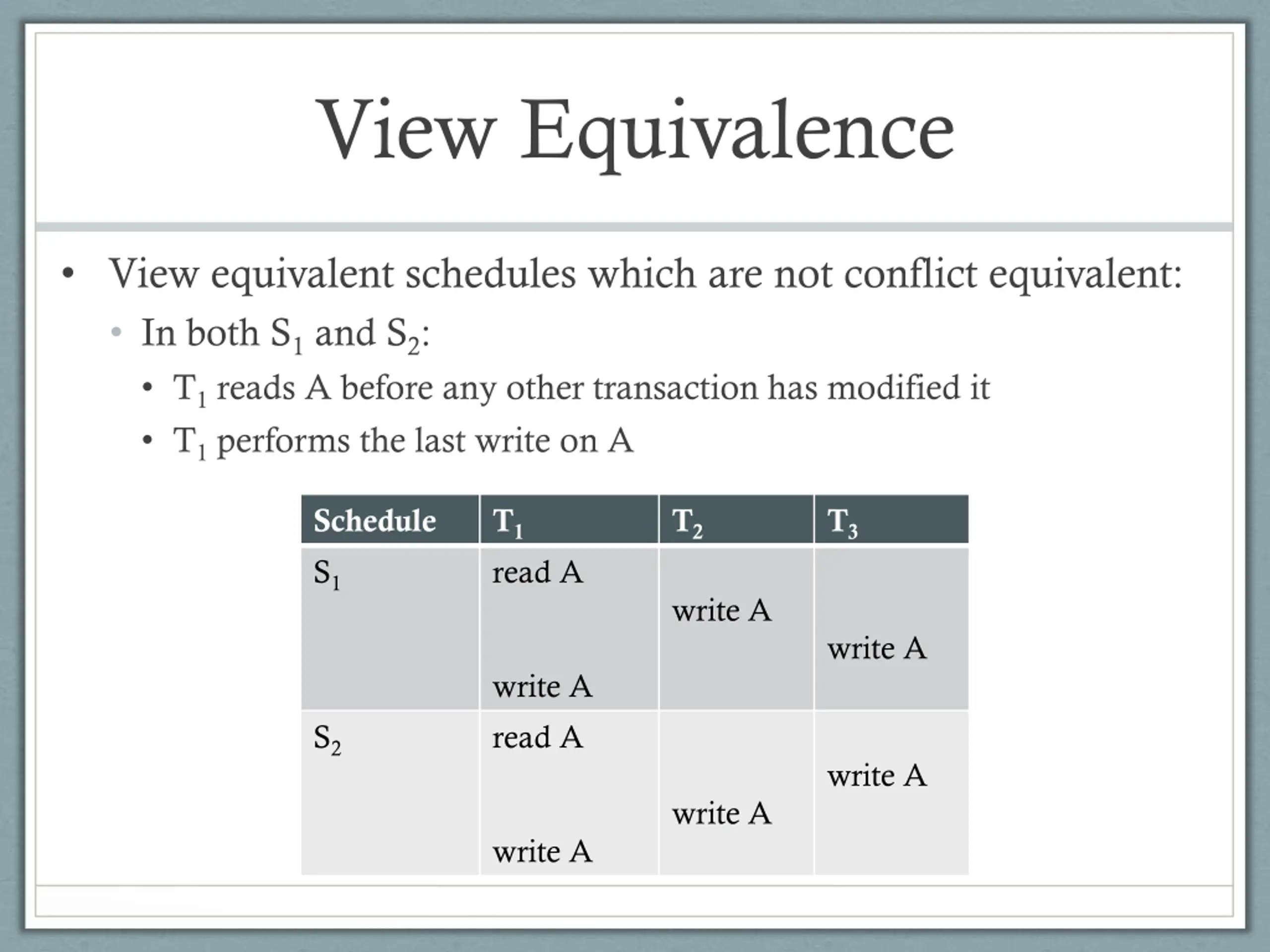 View Equivalence View equivalent schedules which are not conflict equivalent: In both S1 and S2: T1 reads A before any other transaction has modified it T1 performs the last write on A Schedule S1 T1 read A T2 T3 write A write A write A read A S2 write A write A write A