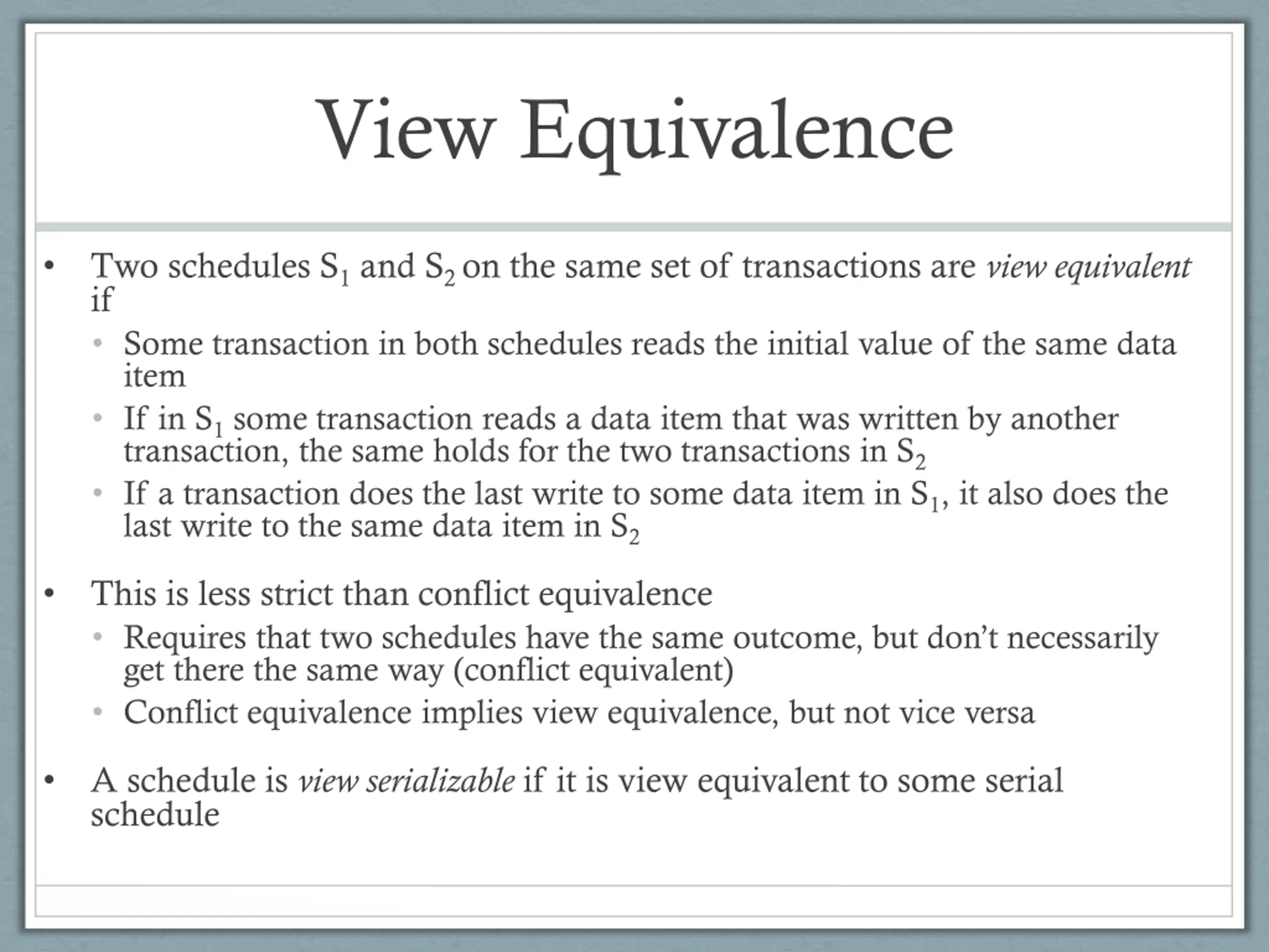 View Equivalence Two schedules S1 and S2 on the same set of transactions are view equivalent if Some transaction in both schedules reads the initial value of the same data item If in S1 some transaction reads a data item that was written by another transaction, the same holds for the two transactions in S2 If a transaction does the last write to some data item in S1, it also does the last write to the same data item in S2 This is less strict than conflict equivalence Requires that two schedules have the same outcome, but don t necessarily get there the same way (conflict equivalent) Conflict equivalence implies view equivalence, but not vice versa A schedule is view serializable if it is view equivalent to some serial schedule