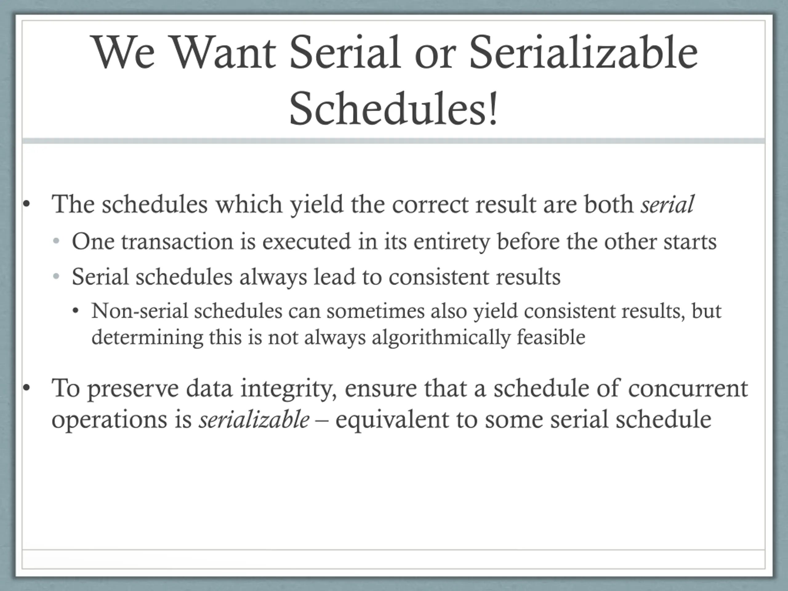 We Want Serial or Serializable Schedules! The schedules which yield the correct result are both serial One transaction is executed in its entirety before the other starts Serial schedules always lead to consistent results Non-serial schedules can sometimes also yield consistent results, but determining this is not always algorithmically feasible To preserve data integrity, ensure that a schedule of concurrent operations is serializable equivalent to some serial schedule