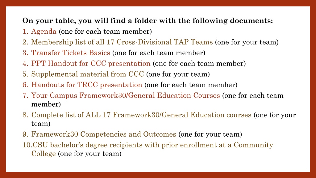 On your table, you will find a folder with the following documents: 1. Agenda (one for each team member) 2. Membership list of all 17 Cross-Divisional TAP Teams (one for your team) 3. Transfer Tickets Basics (one for each team member) 4. PPT Handout for CCC presentation (one for each team member) 5. Supplemental material from CCC (one for your team) 6. Handouts for TRCC presentation (one for each team member) 7. Your Campus Framework30/General Education Courses (one for each team member) 8. Complete list of ALL 17 Framework30/General Education courses (one for your team) 9. Framework30 Competencies and Outcomes (one for your team) 10.CSU bachelor s degree recipients with prior enrollment at a Community College (one for your team)