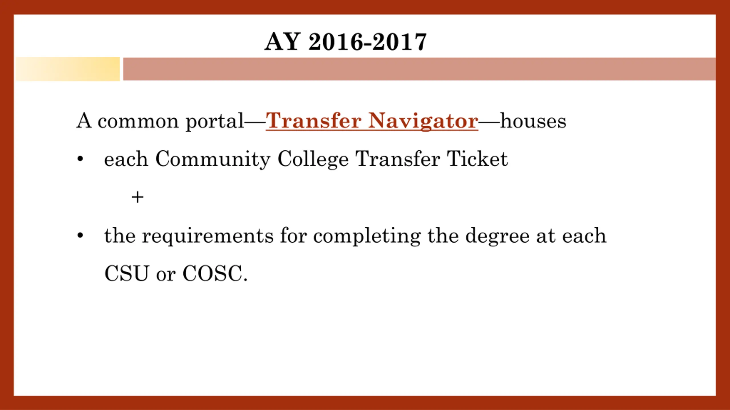 AY 2016-2017 A common portal Transfer Navigator houses each Community College Transfer Ticket + the requirements for completing the degree at each CSU or COSC.