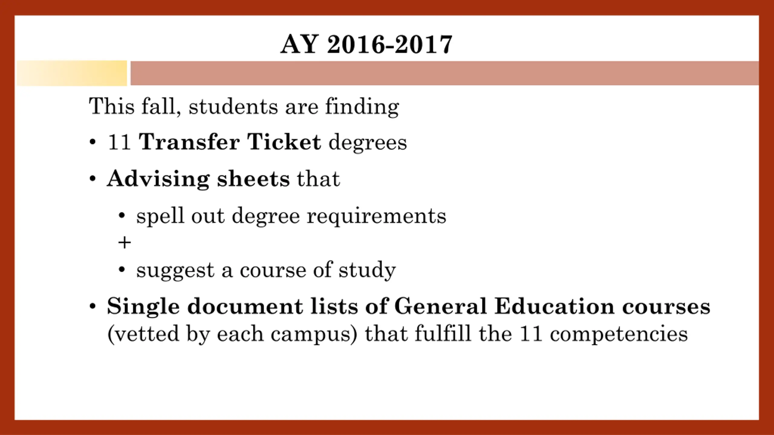 AY 2016-2017 This fall, students are finding 11 Transfer Ticket degrees Advising sheets that spell out degree requirements + suggest a course of study Single document lists of General Education courses (vetted by each campus) that fulfill the 11 competencies