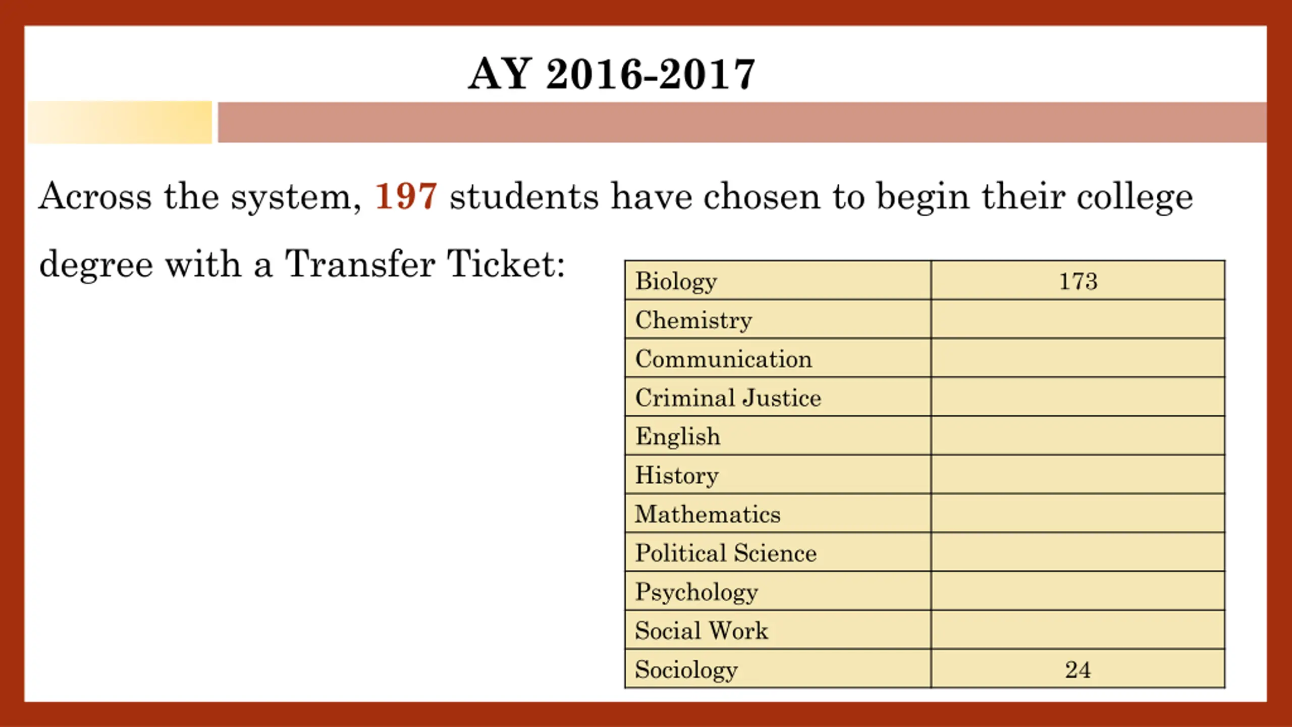 AY 2016-2017 Across the system, 197 students have chosen to begin their college degree with a Transfer Ticket: Biology Chemistry Communication Criminal Justice English History Mathematics Political Science Psychology Social Work Sociology 173 24