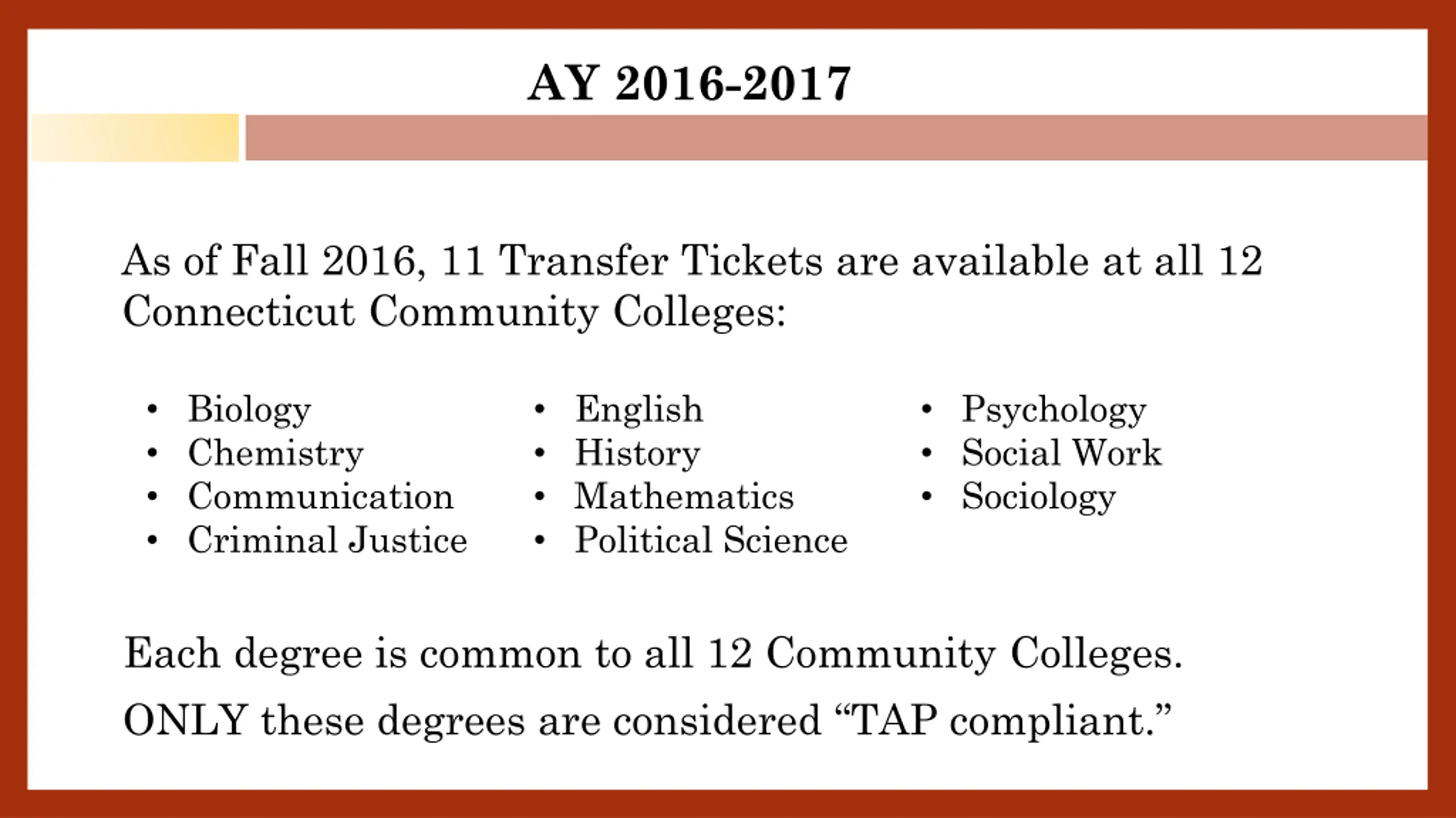 AY 2016-2017 As of Fall 2016, 11 Transfer Tickets are available at all 12 Connecticut Community Colleges: Biology Chemistry Communication Criminal Justice English History Mathematics Political Science Psychology Social Work Sociology Each degree is common to all 12 Community Colleges. ONLY these degrees are considered TAP compliant.