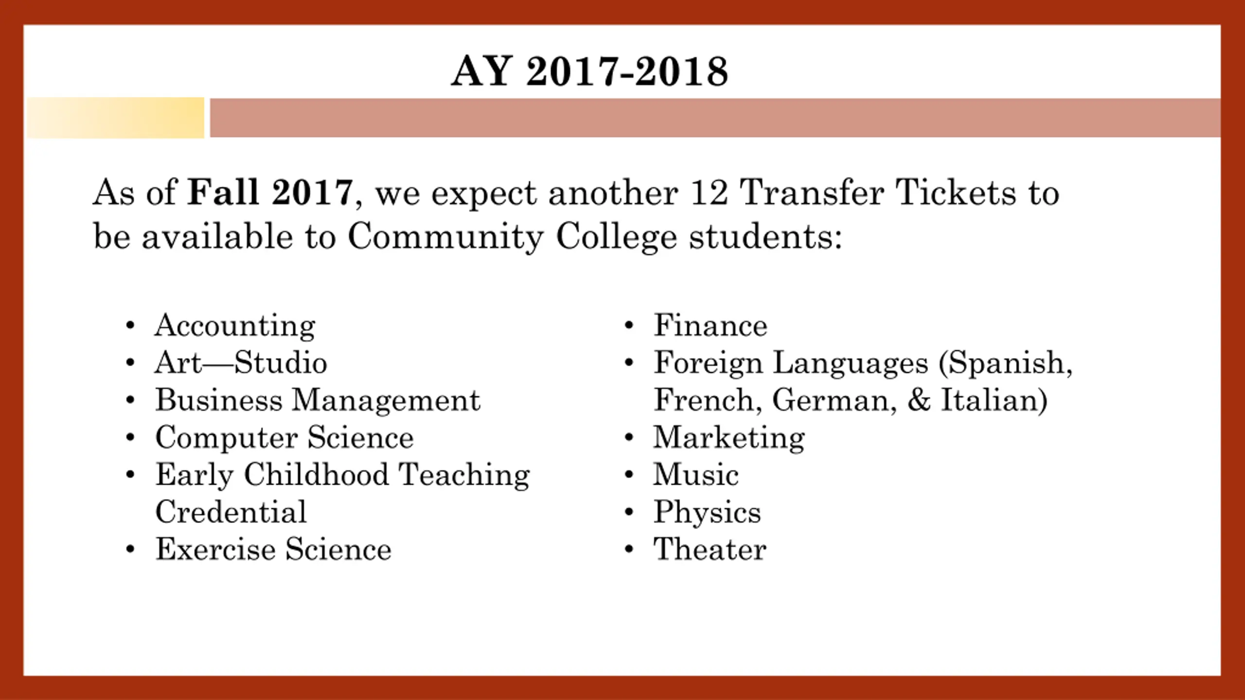 AY 2017-2018 As of Fall 2017, we expect another 12 Transfer Tickets to be available to Community College students: Accounting Art Studio Business Management Computer Science Early Childhood Teaching Credential Exercise Science Finance Foreign Languages (Spanish, French, German, & Italian) Marketing Music Physics Theater