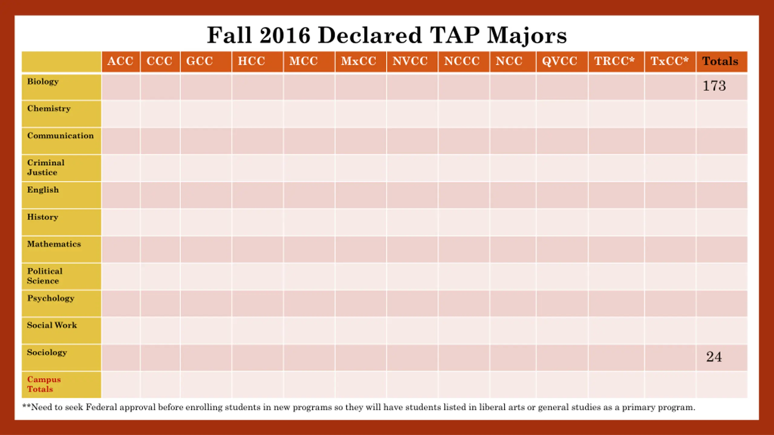 Fall 2016 Declared TAP Majors ACC CCC GCC HCC MCC MxCC NVCC NCCC NCC QVCC TRCC* TxCC* Totals 173 Biology Chemistry Communication Criminal Justice English History Mathematics Political Science Psychology Social Work 24 Sociology Campus Totals **Need to seek Federal approval before enrolling students in new programs so they will have students listed in liberal arts or general studies as a primary program.