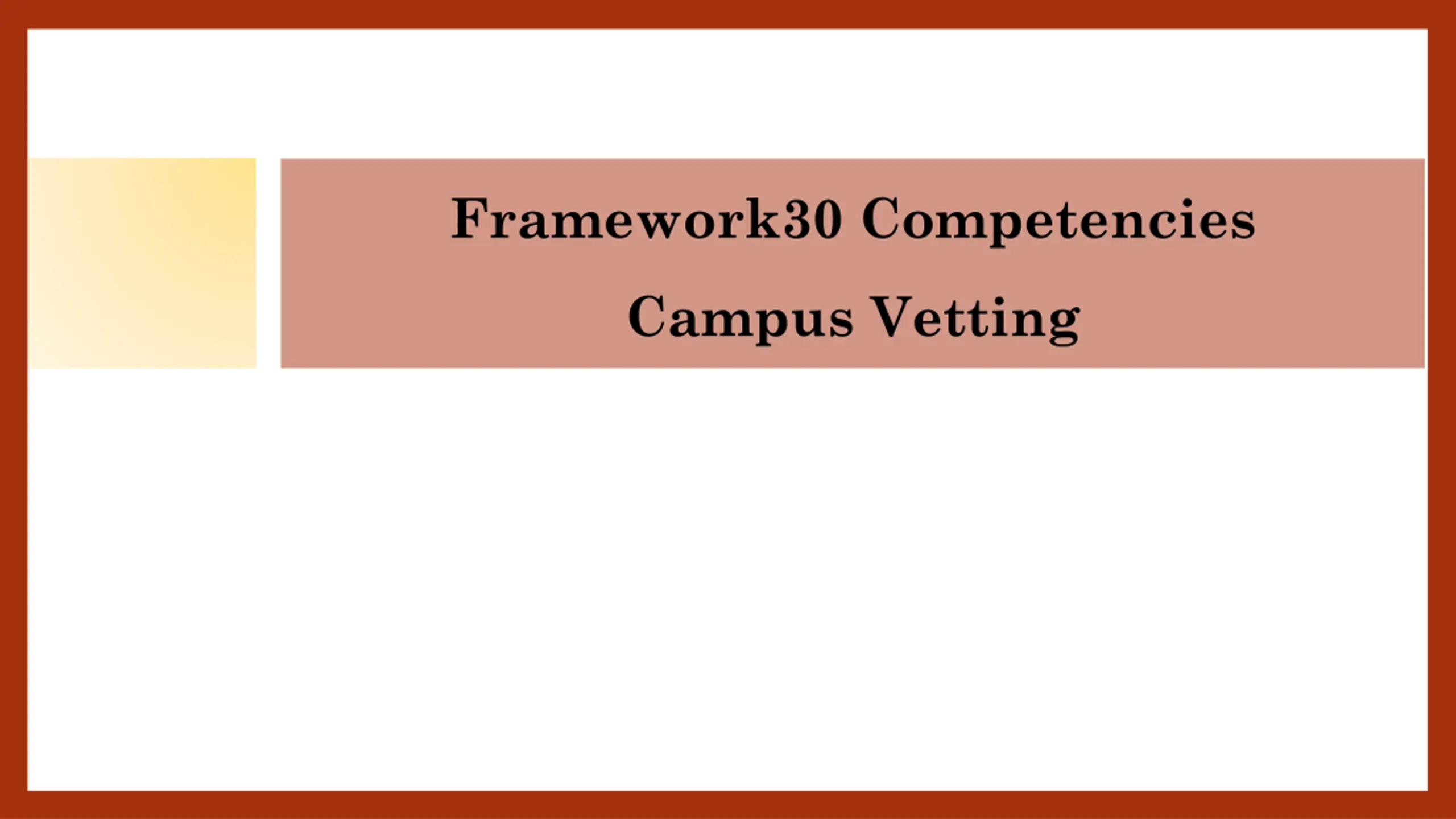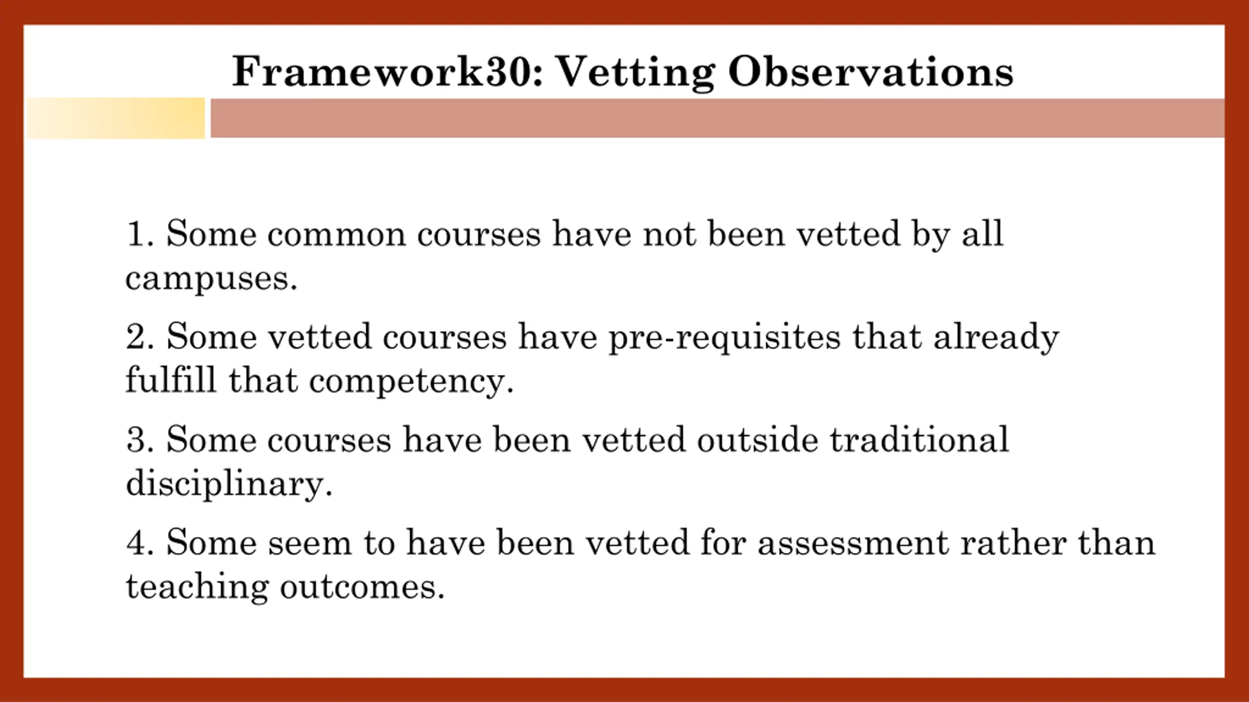 Framework30: Vetting Observations 1. Some common courses have not been vetted by all campuses. 2. Some vetted courses have pre-requisites that already fulfill that competency. 3. Some courses have been vetted outside traditional disciplinary. 4. Some seem to have been vetted for assessment rather than teaching outcomes.