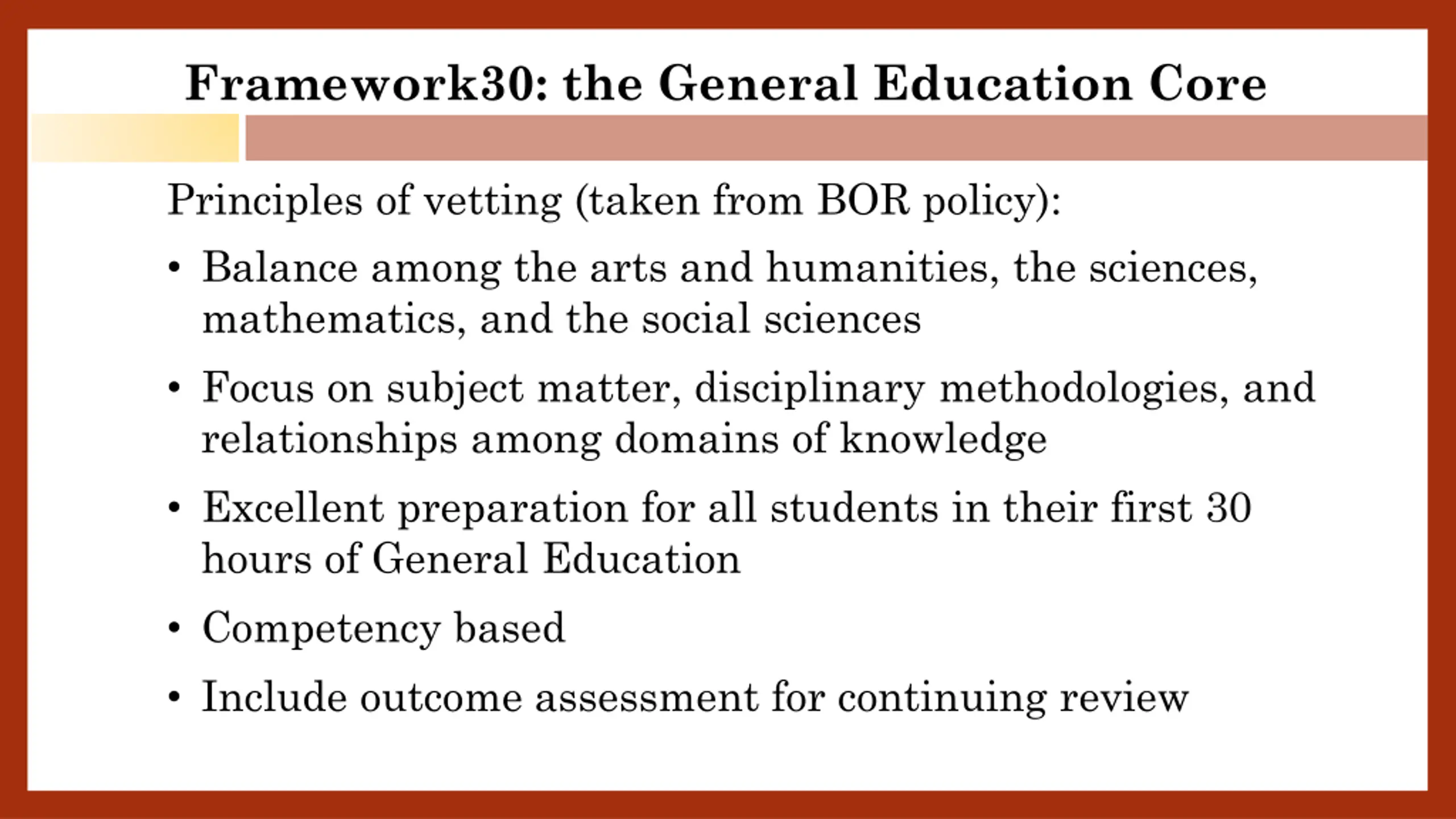 Framework30: the General Education Core Principles of vetting (taken from BOR policy): Balance among the arts and humanities, the sciences, mathematics, and the social sciences Focus on subject matter, disciplinary methodologies, and relationships among domains of knowledge Excellent preparation for all students in their first 30 hours of General Education Competency based Include outcome assessment for continuing review