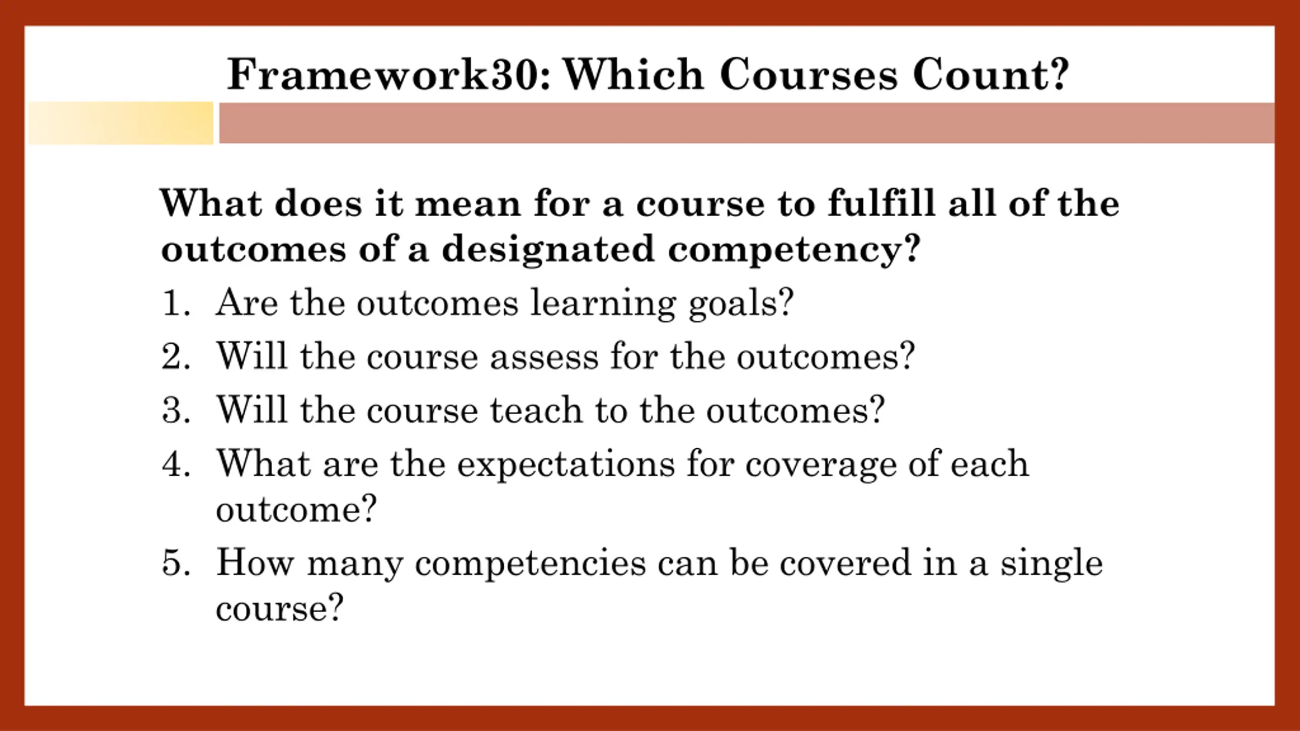Framework30: Which Courses Count? What does it mean for a course to fulfill all of the outcomes of a designated competency? 1. Are the outcomes learning goals? 2. Will the course assess for the outcomes? 3. Will the course teach to the outcomes? 4. What are the expectations for coverage of each outcome? 5. How many competencies can be covered in a single course?