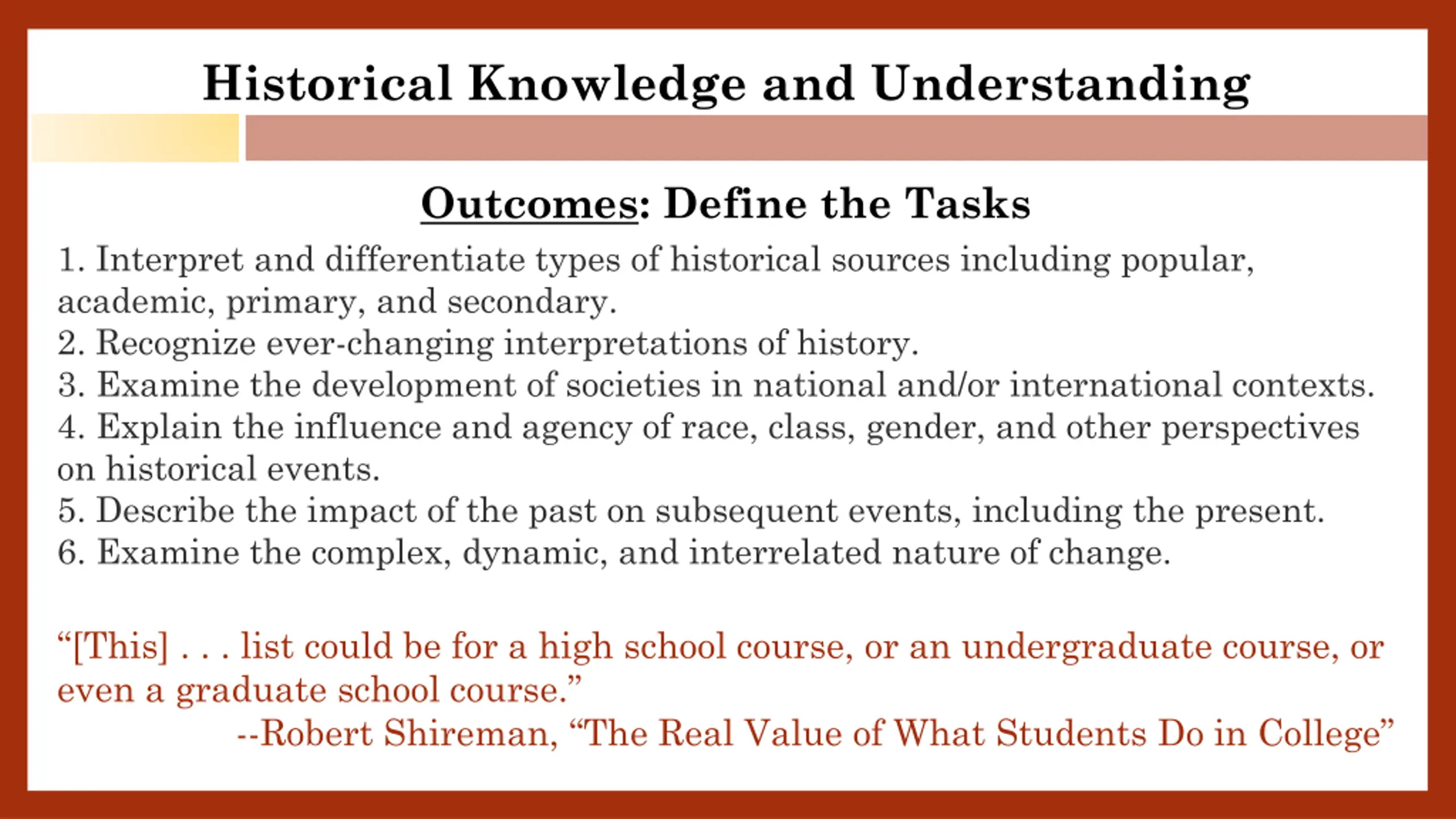 Historical Knowledge and Understanding Outcomes: Define the Tasks 1. Interpret and differentiate types of historical sources including popular, academic, primary, and secondary. 2. Recognize ever-changing interpretations of history. 3. Examine the development of societies in national and/or international contexts. 4. Explain the influence and agency of race, class, gender, and other perspectives on historical events. 5. Describe the impact of the past on subsequent events, including the present. 6. Examine the complex, dynamic, and interrelated nature of change. [This] . . . list could be for a high school course, or an undergraduate course, or even a graduate school course. --Robert Shireman, The Real Value of What Students Do in College