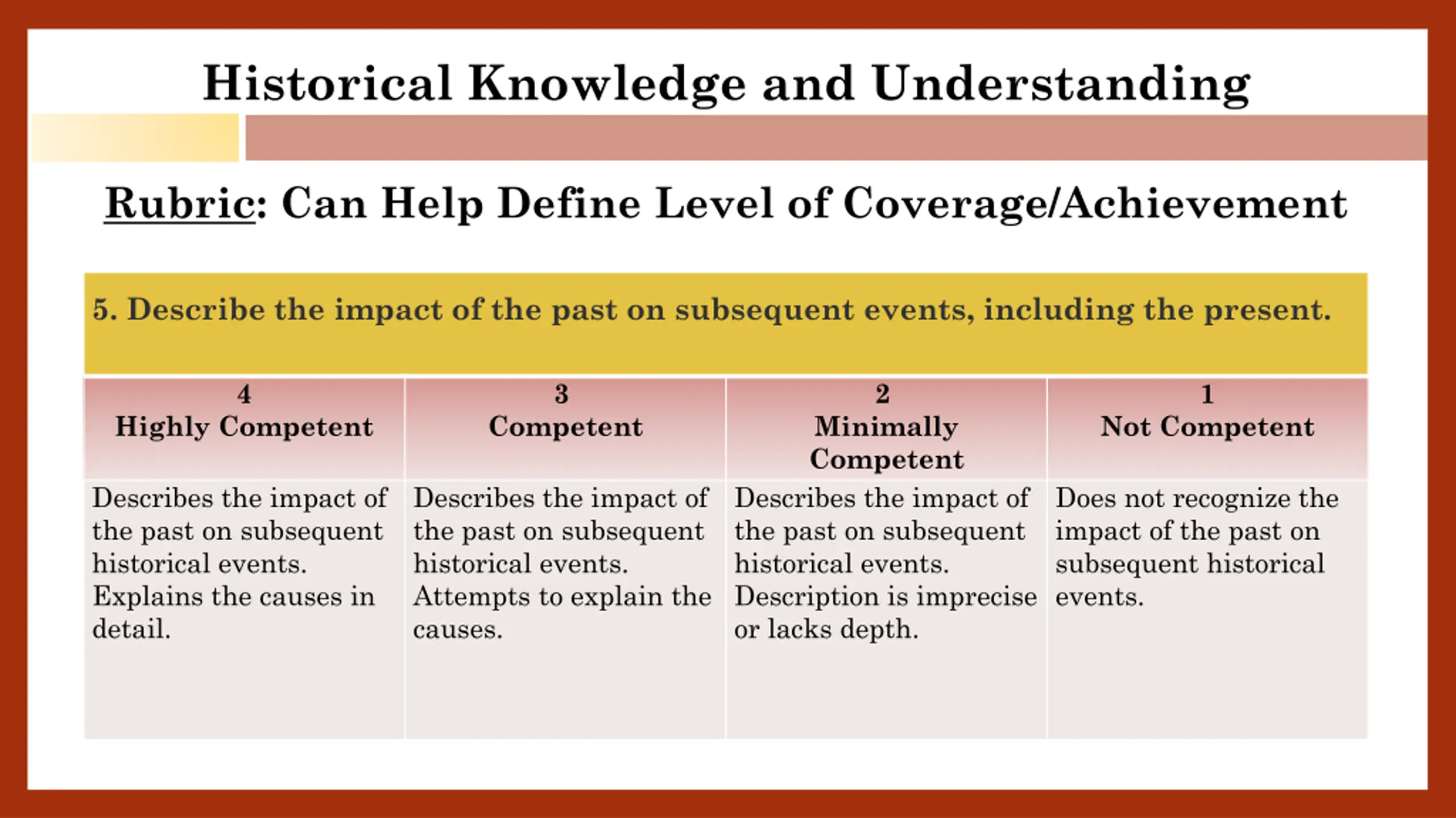 Historical Knowledge and Understanding Rubric: Can Help Define Level of Coverage/Achievement 5. Describe the impact of the past on subsequent events, including the present. 4 3 2 1 Highly Competent Competent Minimally Competent Describes the impact of the past on subsequent historical events. Description is imprecise or lacks depth. Not Competent Describes the impact of the past on subsequent historical events. Explains the causes in detail. Describes the impact of the past on subsequent historical events. Attempts to explain the causes. Does not recognize the impact of the past on subsequent historical events.