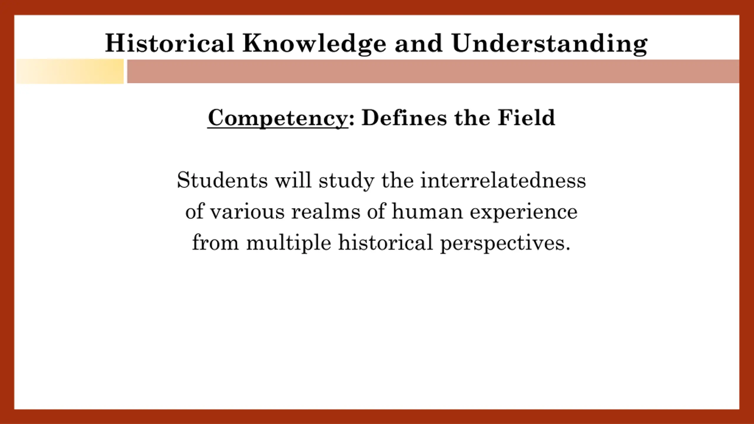 Historical Knowledge and Understanding Competency: Defines the Field Students will study the interrelatedness of various realms of human experience from multiple historical perspectives.