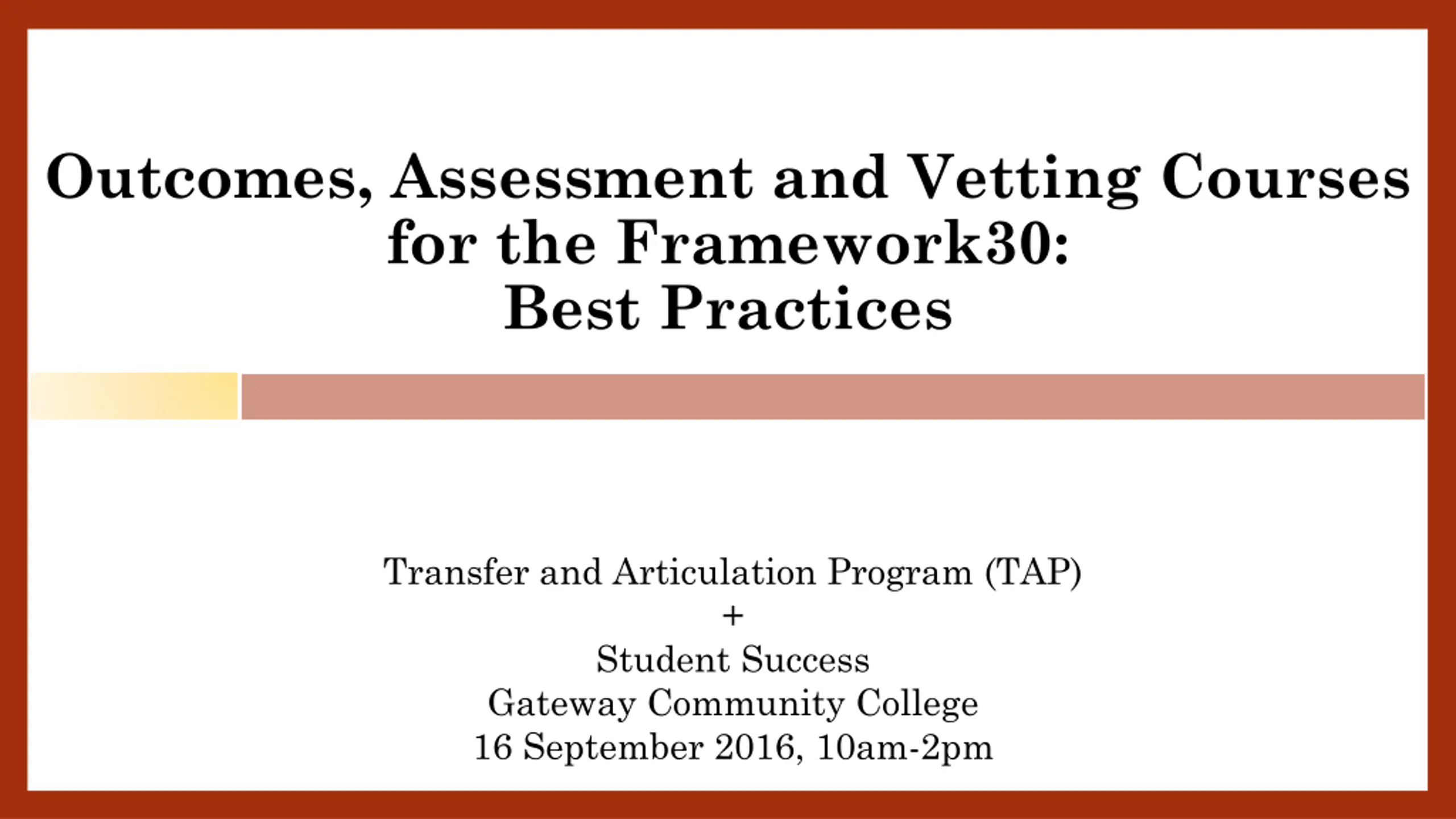 Outcomes, Assessment and Vetting Courses for the Framework30: Best Practices Transfer and Articulation Program (TAP) + Student Success Gateway Community College 16 September 2016, 10am-2pm