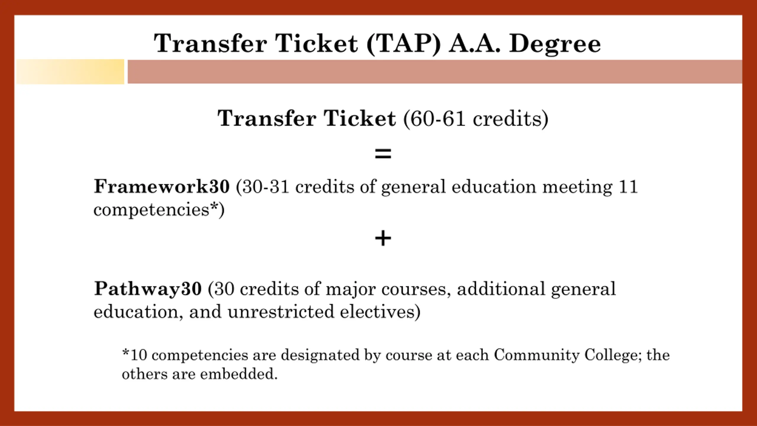 Transfer Ticket (TAP) A.A. Degree Transfer Ticket (60-61 credits) = Framework30 (30-31 credits of general education meeting 11 competencies*) + Pathway30 (30 credits of major courses, additional general education, and unrestricted electives) *10 competencies are designated by course at each Community College; the others are embedded.