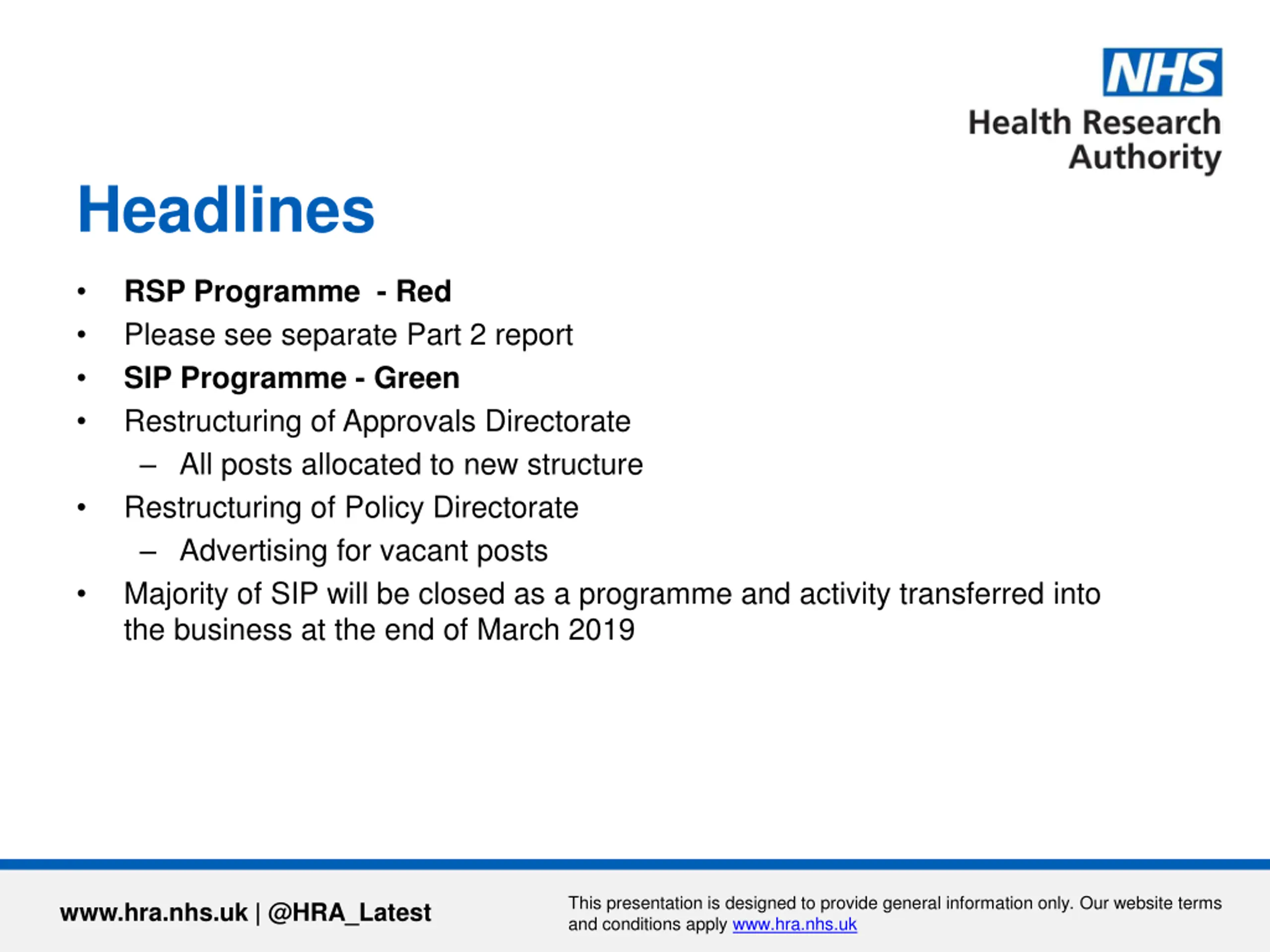 Headlines RSP Programme - Red Please see separate Part 2 report SIP Programme - Green Restructuring of Approvals Directorate All posts allocated to new structure Restructuring of Policy Directorate Advertising for vacant posts Majority of SIP will be closed as a programme and activity transferred into the business at the end of March 2019 This presentation is designed to provide general information only. Our website terms and conditions apply www.hra.nhs.uk www.hra.nhs.uk | @HRA_Latest www.hra.nhs.uk
