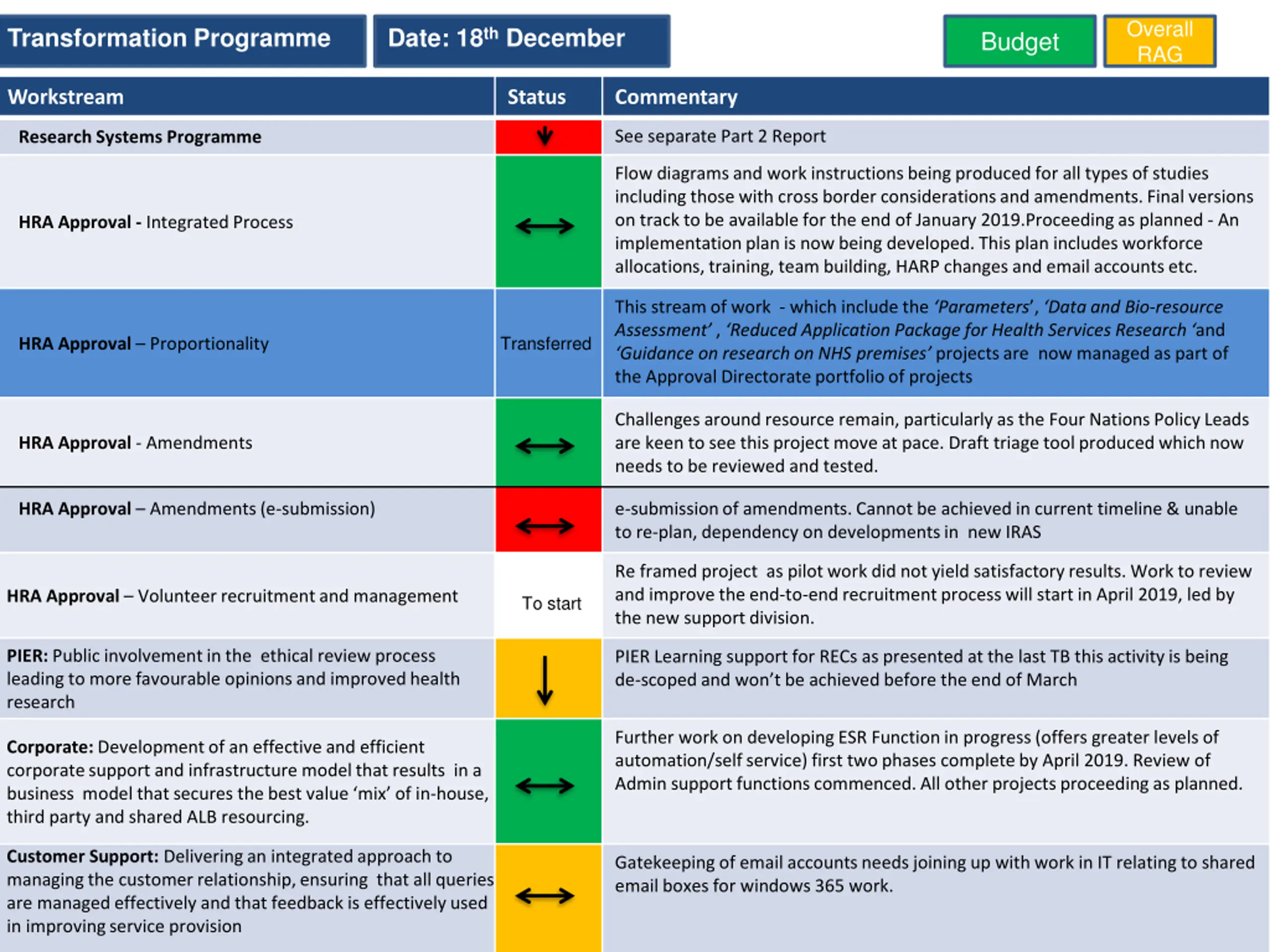 Overall RAG Transformation Programme Date: 18th December Budget Workstream Status Commentary See separate Part 2 Report Research Systems Programme Flow diagrams and work instructions being produced for all types of studies including those with cross border considerations and amendments. Final versions on track to be available for the end of January 2019.Proceeding as planned - An implementation plan is now being developed. This plan includes workforce allocations, training, team building, HARP changes and email accounts etc. HRA Approval - Integrated Process This stream of work - which include the Parameters , Data and Bio-resource Assessment , Reduced Application Package for Health Services Research and Guidance on research on NHS premises projects are now managed as part of the Approval Directorate portfolio of projects Transferred HRA Approval Proportionality Challenges around resource remain, particularly as the Four Nations Policy Leads are keen to see this project move at pace. Draft triage tool produced which now needs to be reviewed and tested. HRA Approval - Amendments HRA Approval Amendments (e-submission) e-submission of amendments. Cannot be achieved in current timeline & unable to re-plan, dependency on developments in new IRAS Re framed project as pilot work did not yield satisfactory results. Work to review and improve the end-to-end recruitment process will start in April 2019, led by the new support division. HRAApproval Volunteer recruitment and management To start PIER: Public involvement in the ethical review process leading to more favourable opinions and improved health research PIER Learning support for RECs as presented at the last TB this activity is being de-scoped and won t be achieved before the end of March Further work on developing ESR Function in progress (offers greater levels of automation/self service) first two phases complete by April 2019. Review of Admin support functions commenced. All other projects proceeding as planned. Corporate: Development of an effective and efficient corporate support and infrastructure model that results in a business model that secures the best value mix of in-house, third party and shared ALB resourcing. Customer Support: Delivering an integrated approach to managing the customer relationship, ensuring that all queries are managed effectively and that feedback is effectively used in improving service provision Gatekeeping of email accounts needs joining up with work in IT relating to shared email boxes for windows 365 work.