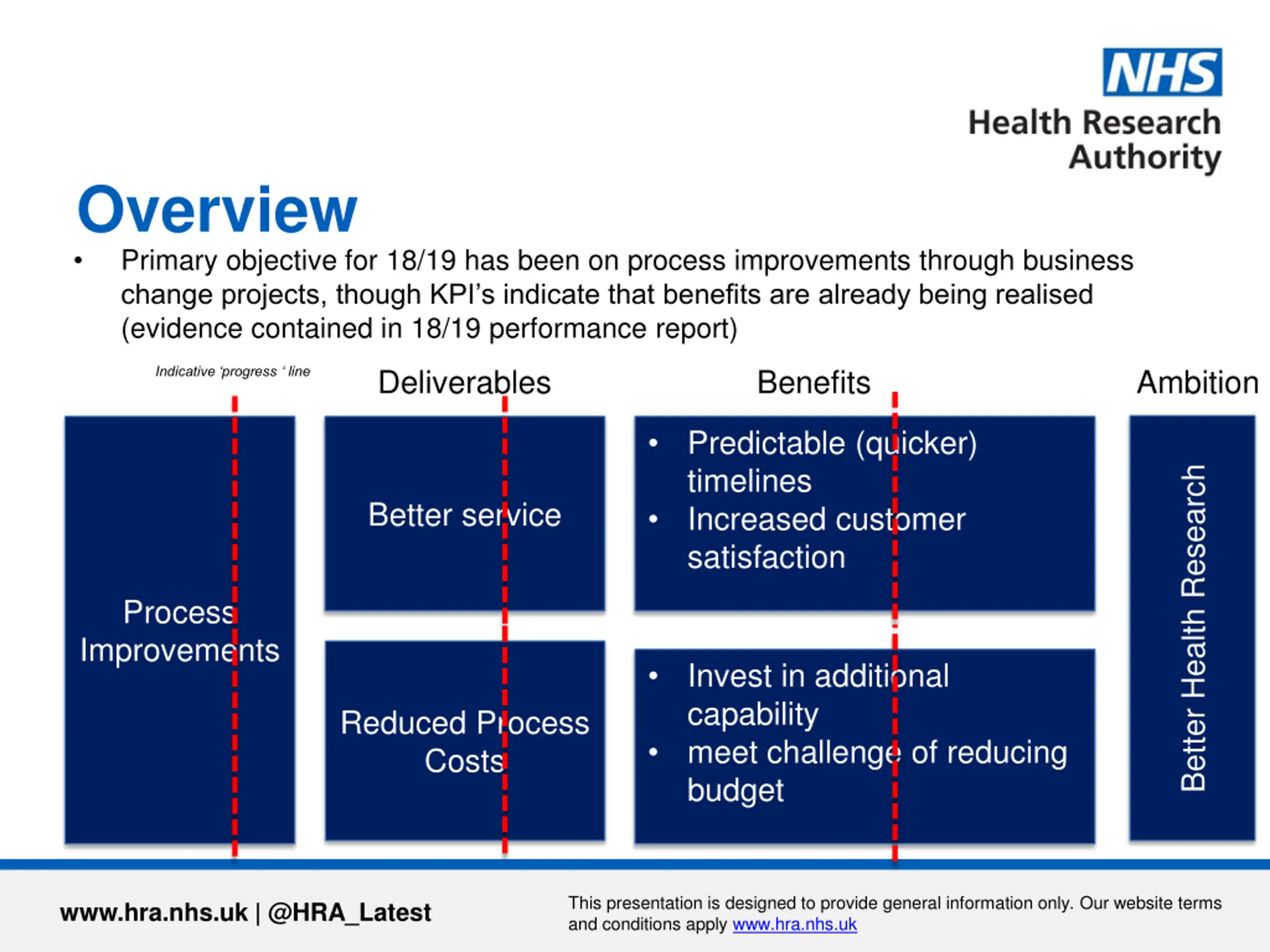 Overview Primary objective for 18/19 has been on process improvements through business change projects, though KPI s indicate that benefits are already being realised (evidence contained in 18/19 performance report) Deliverables Benefits Ambition Indicative progress line Predictable (quicker) timelines Increased customer satisfaction Better Health Research Better service Process Improvements Invest in additional capability meet challenge of reducing budget Reduced Process Costs This presentation is designed to provide general information only. Our website terms and conditions apply www.hra.nhs.uk www.hra.nhs.uk | @HRA_Latest www.hra.nhs.uk
