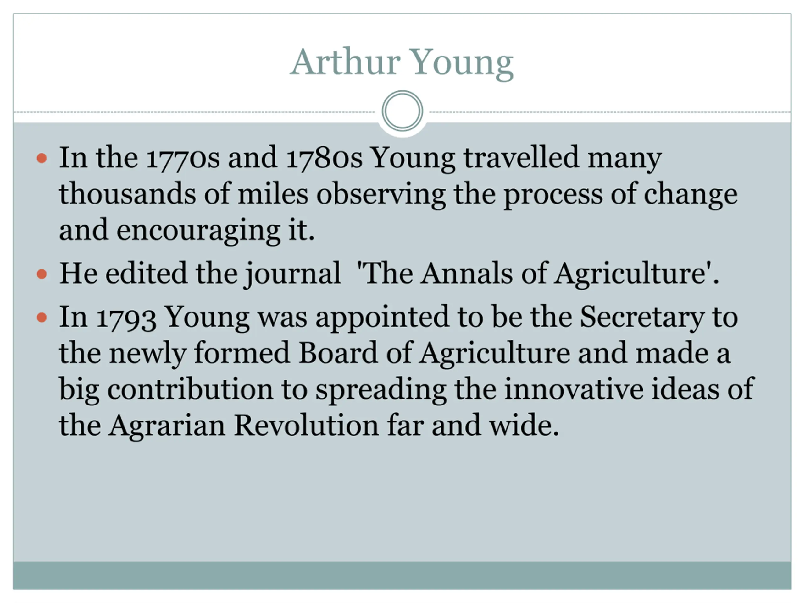 Arthur Young In the 1770s and 1780s Young travelled many thousands of miles observing the process of change and encouraging it. He edited the journal 'The Annals of Agriculture'. In 1793 Young was appointed to be the Secretary to the newly formed Board of Agriculture and made a big contribution to spreading the innovative ideas of the Agrarian Revolution far and wide.