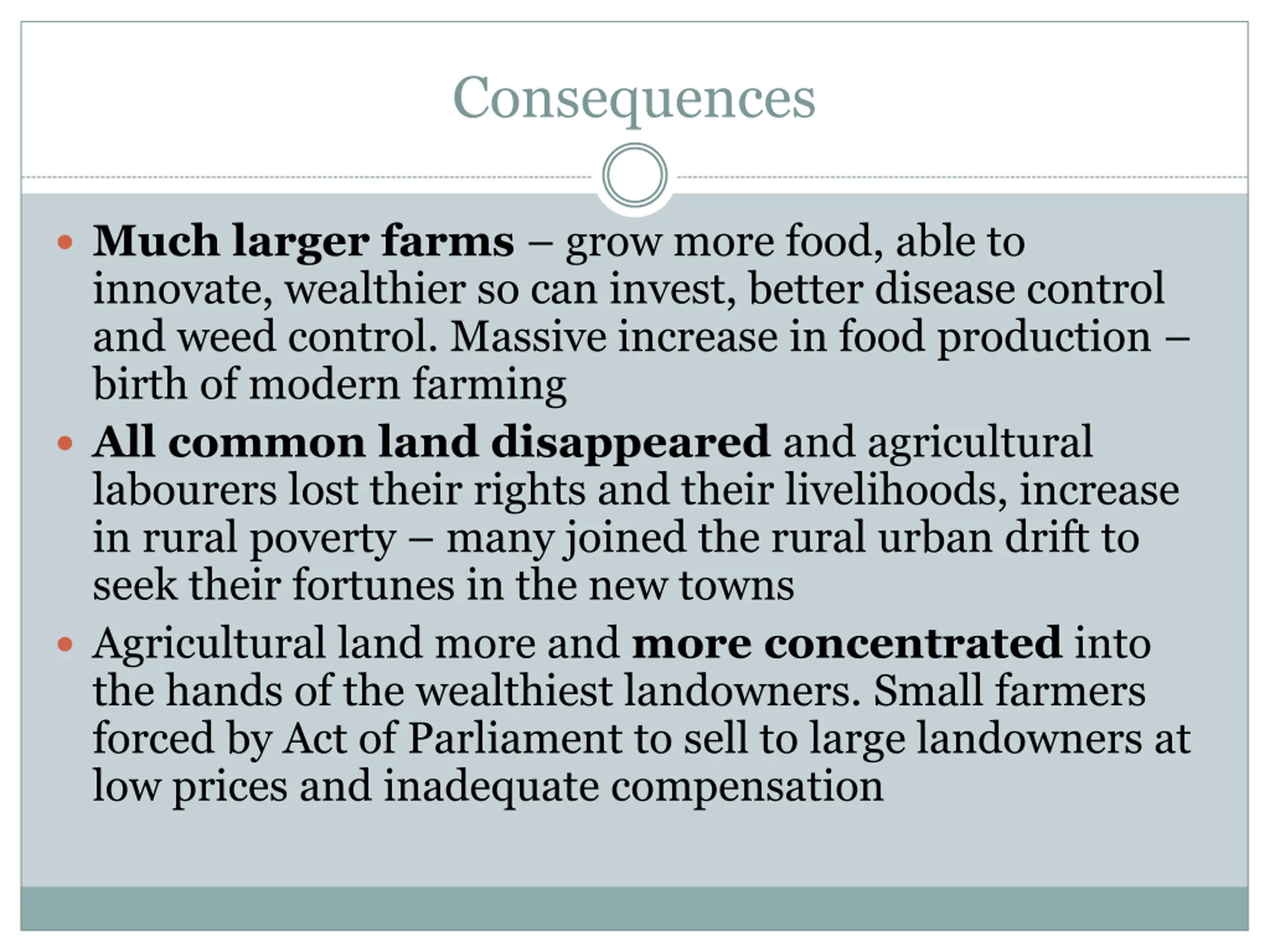 Consequences Much larger farms grow more food, able to innovate, wealthier so can invest, better disease control and weed control. Massive increase in food production birth of modern farming All common land disappeared and agricultural labourers lost their rights and their livelihoods, increase in rural poverty many joined the rural urban drift to seek their fortunes in the new towns Agricultural land more and more concentrated into the hands of the wealthiest landowners. Small farmers forced by Act of Parliament to sell to large landowners at low prices and inadequate compensation