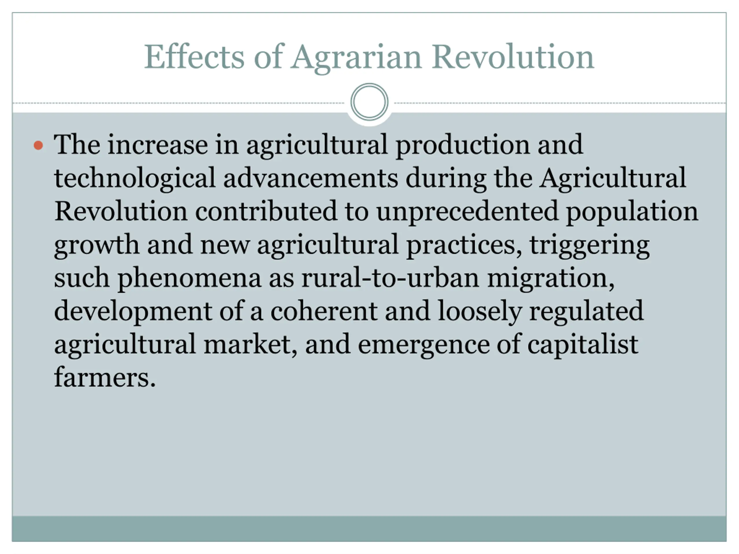 Effects of Agrarian Revolution The increase in agricultural production and technological advancements during the Agricultural Revolution contributed to unprecedented population growth and new agricultural practices, triggering such phenomena as rural-to-urban migration, development of a coherent and loosely regulated agricultural market, and emergence of capitalist farmers.
