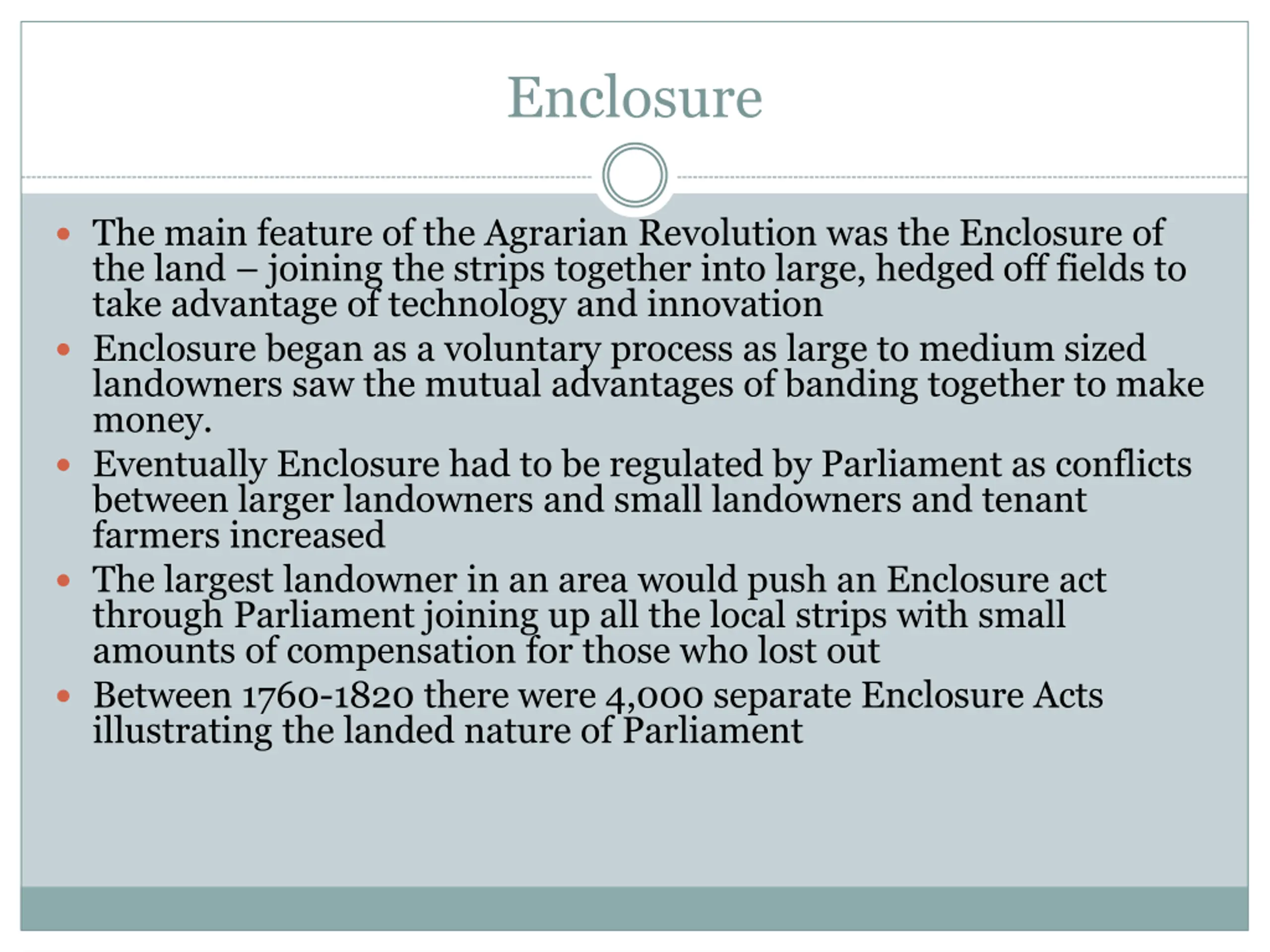 Enclosure The main feature of the Agrarian Revolution was the Enclosure of the land joining the strips together into large, hedged off fields to take advantage of technology and innovation Enclosure began as a voluntary process as large to medium sized landowners saw the mutual advantages of banding together to make money. Eventually Enclosure had to be regulated by Parliament as conflicts between larger landowners and small landowners and tenant farmers increased The largest landowner in an area would push an Enclosure act through Parliament joining up all the local strips with small amounts of compensation for those who lost out Between 1760-1820 there were 4,000 separate Enclosure Acts illustrating the landed nature of Parliament