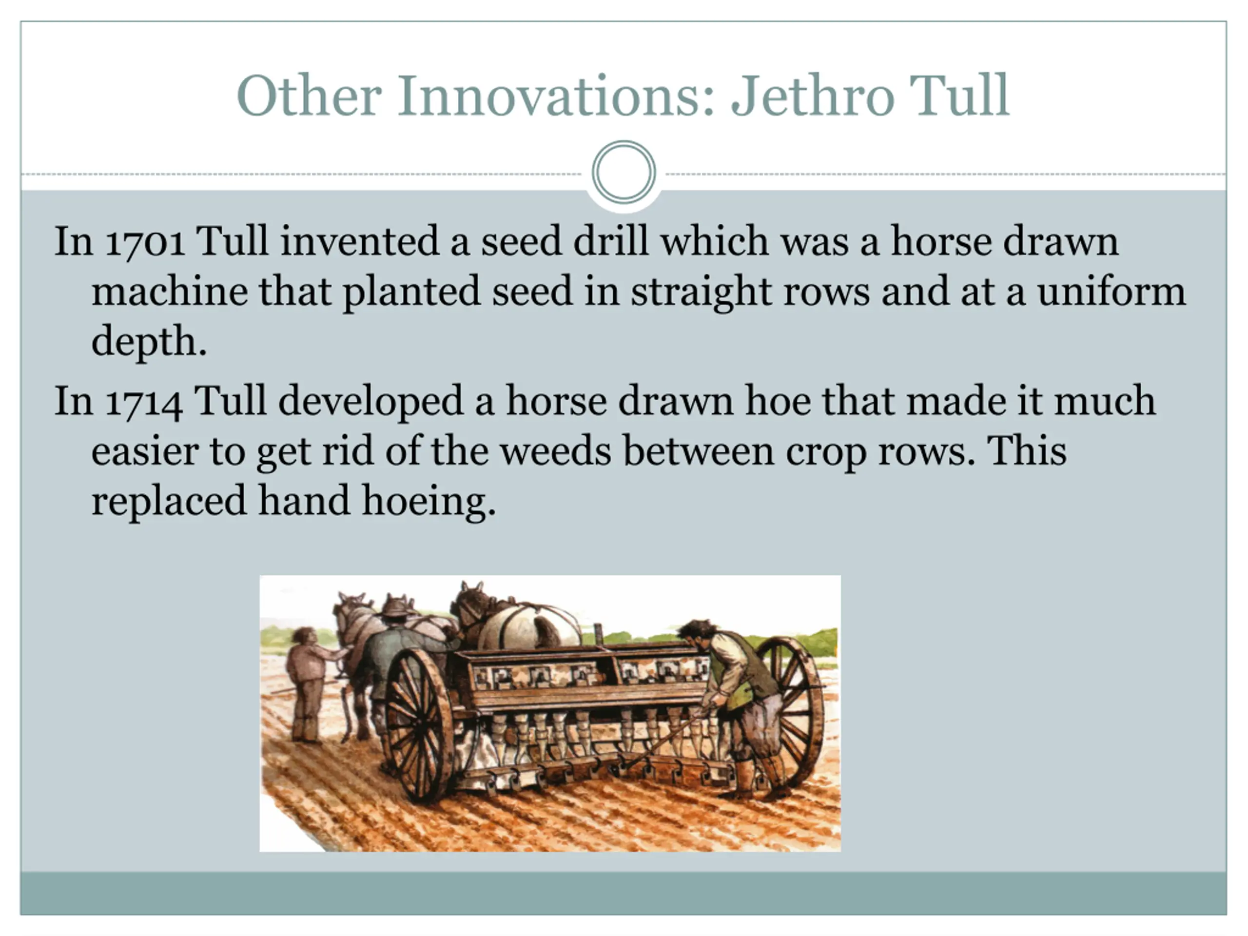 Other Innovations: Jethro Tull In 1701 Tull invented a seed drill which was a horse drawn machine that planted seed in straight rows and at a uniform depth. In 1714 Tull developed a horse drawn hoe that made it much easier to get rid of the weeds between crop rows. This replaced hand hoeing.