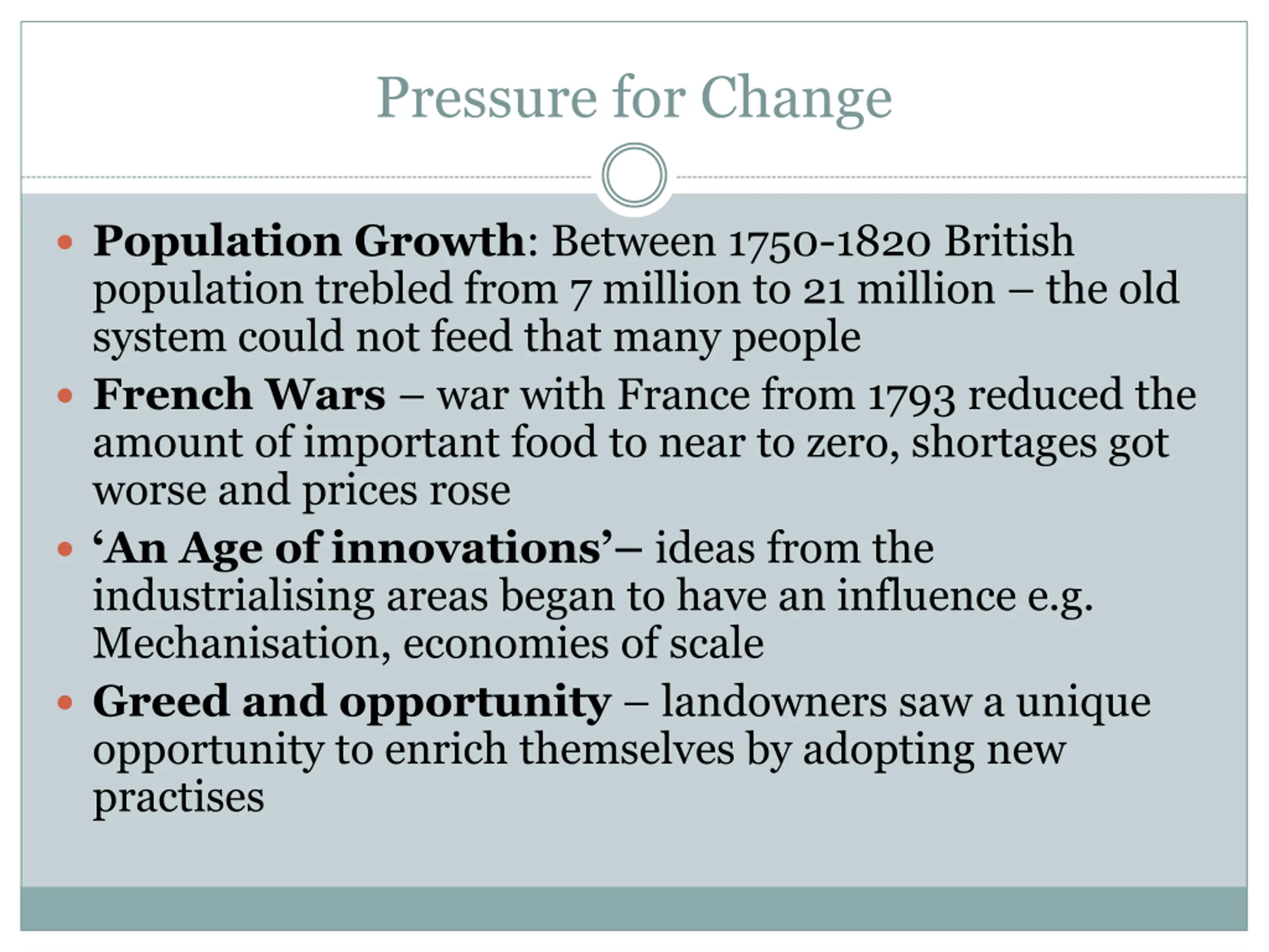 Pressure for Change Population Growth: Between 1750-1820 British population trebled from 7 million to 21 million the old system could not feed that many people French Wars war with France from 1793 reduced the amount of important food to near to zero, shortages got worse and prices rose An Age of innovations ideas from the industrialising areas began to have an influence e.g. Mechanisation, economies of scale Greed and opportunity landowners saw a unique opportunity to enrich themselves by adopting new practises