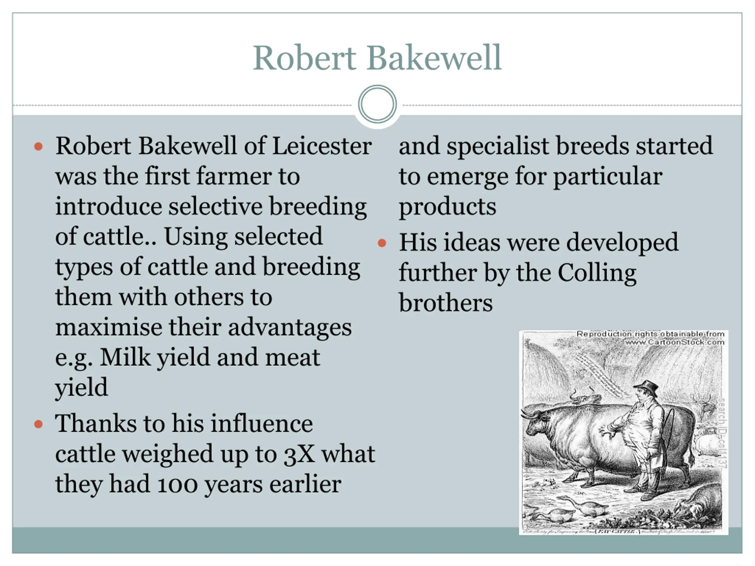Robert Bakewell Robert Bakewell of Leicester was the first farmer to introduce selective breeding of cattle.. Using selected types of cattle and breeding them with others to maximise their advantages e.g. Milk yield and meat yield Thanks to his influence cattle weighed up to 3X what they had 100 years earlier and specialist breeds started to emerge for particular products His ideas were developed further by the Colling brothers